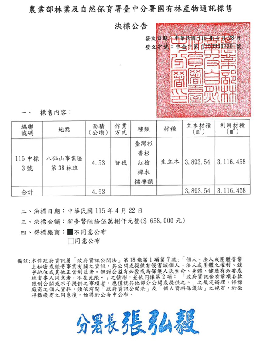 臺中分署115中標3號國有林林產物標售決標公告