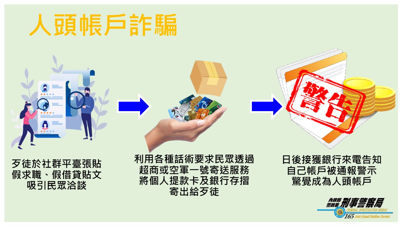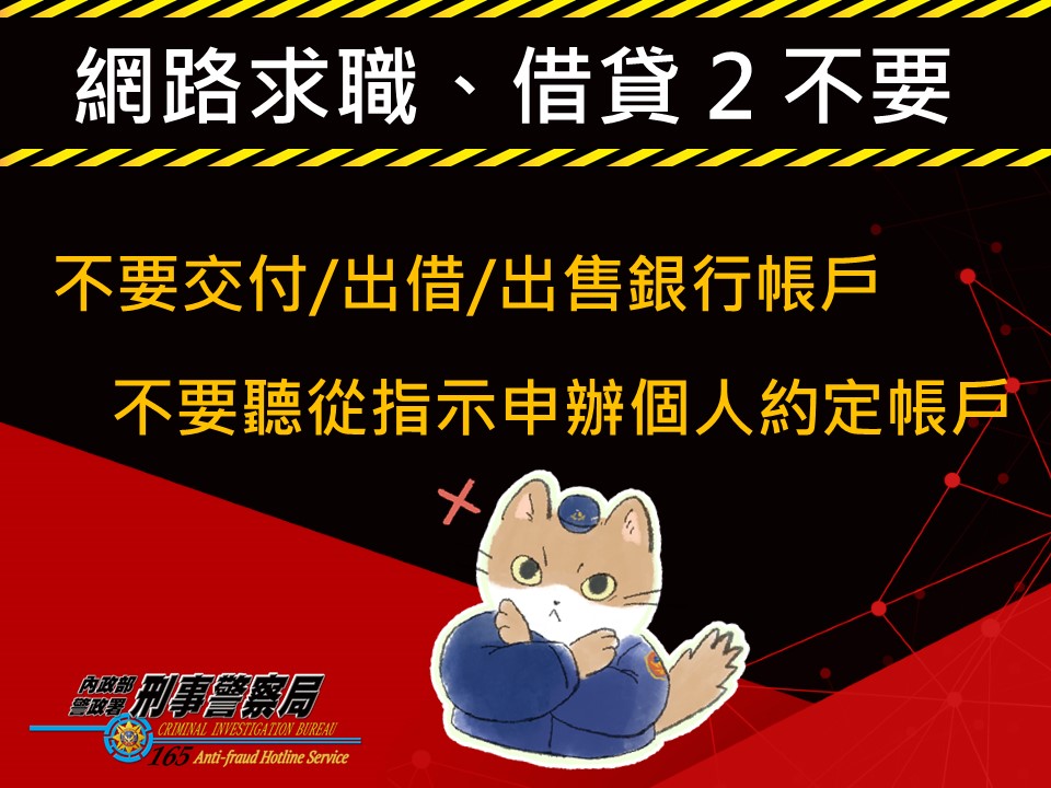 為加強宣導民眾慎防「假求職」、「假借貸」訊息,避免貿然提供個人帳戶,致遭利用為人頭帳戶,甚危及人身安全及自由,內政部警政署業製作影片4部、圖片18幅,近期發布之新聞稿及宣導文章連結等素材。 《延伸閱讀》 1、<什麼是人頭帳戶?> <詐騙手法大公開> https://165.npa.gov.tw/#/article/news/474 2、防範網路詐騙有絕招,假求職詐騙 https://165.npa.gov.tw/#/article/news/449 3、提供個人銀行存摺提款卡供放款?你會是下一個人頭帳戶! https://165.npa.gov.tw/#/article/news/205 4、「求職務必停看聽,人才小心變人頭」 https://165.npa.gov.tw/#/article/news/51 5、網路求職、借貸 2 no no https://www.facebook.com/165bear/posts/pfbid032KbkeWT15vQBpUwdBaDifC77qN8ofd2PPLdL4bi2eAqmNnqGrX2KXCmCByMKfBkol 6、網路求職一堆騙子 https://www.facebook.com/165bear/posts/pfbid02w7k396iqEVtoFPYQHdHDEuEisuzETadQEHuCBLvAjcdTzEaMZr4VD1tJHR5zbzWol 7、【Whoscall × 新北市府 查詐事件簿】新鮮人必讀!「求職防詐守則」解析詐騙手法 輕鬆遠離常見陷阱 https://whoscall.com/zh-hant/blog/articles/548