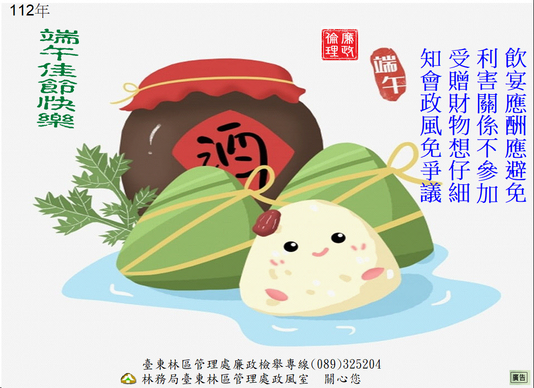 一、端午節將屆,請遵守「公務員廉政倫理規範」之規定,如遇有與職務上利害關係之個人、法人、團體餽贈財物或邀宴應酬,應予拒絕或退還,並落實報備登錄。 二、公務員遇有請託關說,應於三日內簽報其長官並知會政風機構,落實辦理登錄程序,以保障自身權益。 三、為深化同仁對廉政倫理法令之認知,請同仁積極運用行政院人事行政總處公務人力發展學院「e等公務園學習網+學習平臺」(https://elearn.hrd.gov.tw/mooc/index.php)等教學資源,選讀廉政倫理等相關線上學習課程。