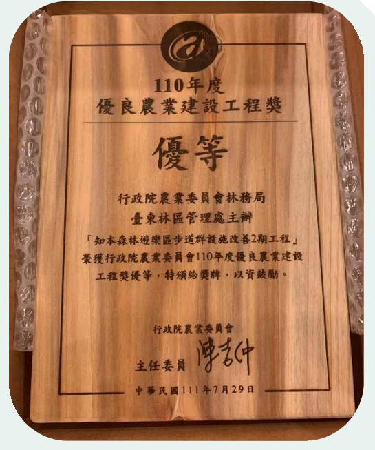 ::: 回首頁> 關於我們 > 榮譽事蹟 > 110年榮譽事蹟-「知本國家森林遊樂區步道群設施改善二期工程」榮獲優良農建優等 跳過此子選單列請按[Enter],繼續則按[Tab] 列印 分享 Facebook gplus twitter plurk 字級小 字級中 字級大 110年榮譽事蹟-「知本國家森林遊樂區步道群設施改善二期工程」榮獲優良農建優等 ::: 「知本國家森林遊樂區步道群設施改善二期工程」優良農建優等佳績。 本案依據林務局步道工法設計手冊辦理設計,融合自然環境並選用適地適性的材料與工法,有效串連園區內的森林浴步道、好漢坡步道、七里香步道、景觀步道及榕蔭步道,提升遊憩品質與遊客服務。 相關照片 下列為本網站使用鍵盤操作相簿功能說明: 向上鍵:照片選單顯示 向下鍵:照片選單隱藏 向左鍵:上一張照片 向右鍵:下一張照片 ESC鍵:離開相簿 瀏覽人次:496 最後更新日期:2023-10-02