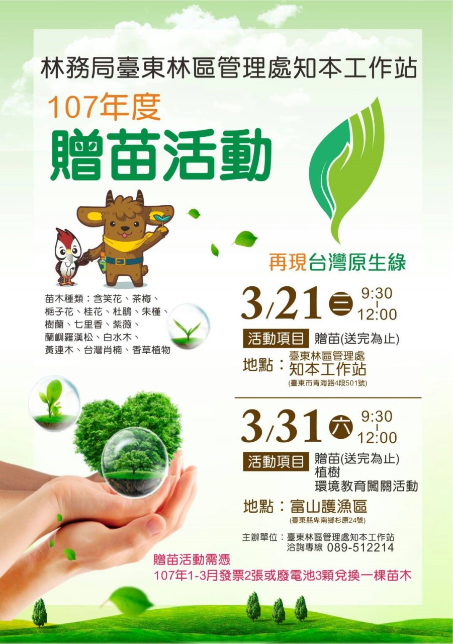 每年三月正逢春意盎然、萬物滋生之際,在此春暖花開的時節,臺東林管理處知本工作站配合林務局「再現台灣原生綠」活動主題展開多場植樹贈苗活動。首發登場的是107年3月17日(星期六)上午9時30分起,於知本國家森林遊樂區舉辦「上山種下一棵樹、建造夢想家園」—環境教育植樹贈苗農民市集活動。 第二場107年3月21日(星期三) 上午9時30分起將於知本站廣場前辦理贈苗,鼓勵居民將苗木帶回家栽種,除美化家園環境,也用行動愛地球,再現台灣原生綠。 第三場107年3月31日(星期六) 上午9時30分起於富山護漁區生態教室前廣場辦理富山國小師生及鄰近部落居民植樹、贈苗活動外,並第一場次環教單位及史博館等辦理環境教育闖關遊戲,希望透過海岸林營造及海洋垃圾議題的探討,讓居住在鄰近太平洋的我們更加友善永續海洋生態。 第一場活動將由知本自然教育中心專案教師帶領與會來賓、知本地區國民中、小學學童、社區居民及飯店業者展開由台東大學協助編寫在地建造夢想家園繪本分享及種下守護知本的愛心樹外、也贈送預先報名當天參與植樹人員一棵愛心樹;另外並結合林業試驗所太麻里研究中心、社團法人荒野保護學會、臺東野鳥協會、臺東臺東縣消防局知本分隊、臺東環境教育中心及本處知本自然教育中心辦理環境教育闖關遊戲。農民市集也將到場展(售)示在地好物及農特產品,更在現場提供50份免費DIY體驗(市集活動至15:00),期望讓參與民眾不僅寓教於樂,還能滿載而歸。 各場贈苗活動贈送的苗木有含笑花、桂花、樹蘭、梔子花、七里香,及觀花的杜鵑、朱槿、紫葳、茶梅等,另有適合庭園景觀營造的蘭嶼羅漢松、白水木、黃連木及肖楠等苗木,每場次也有搭配限量提供不同種類香草植物。