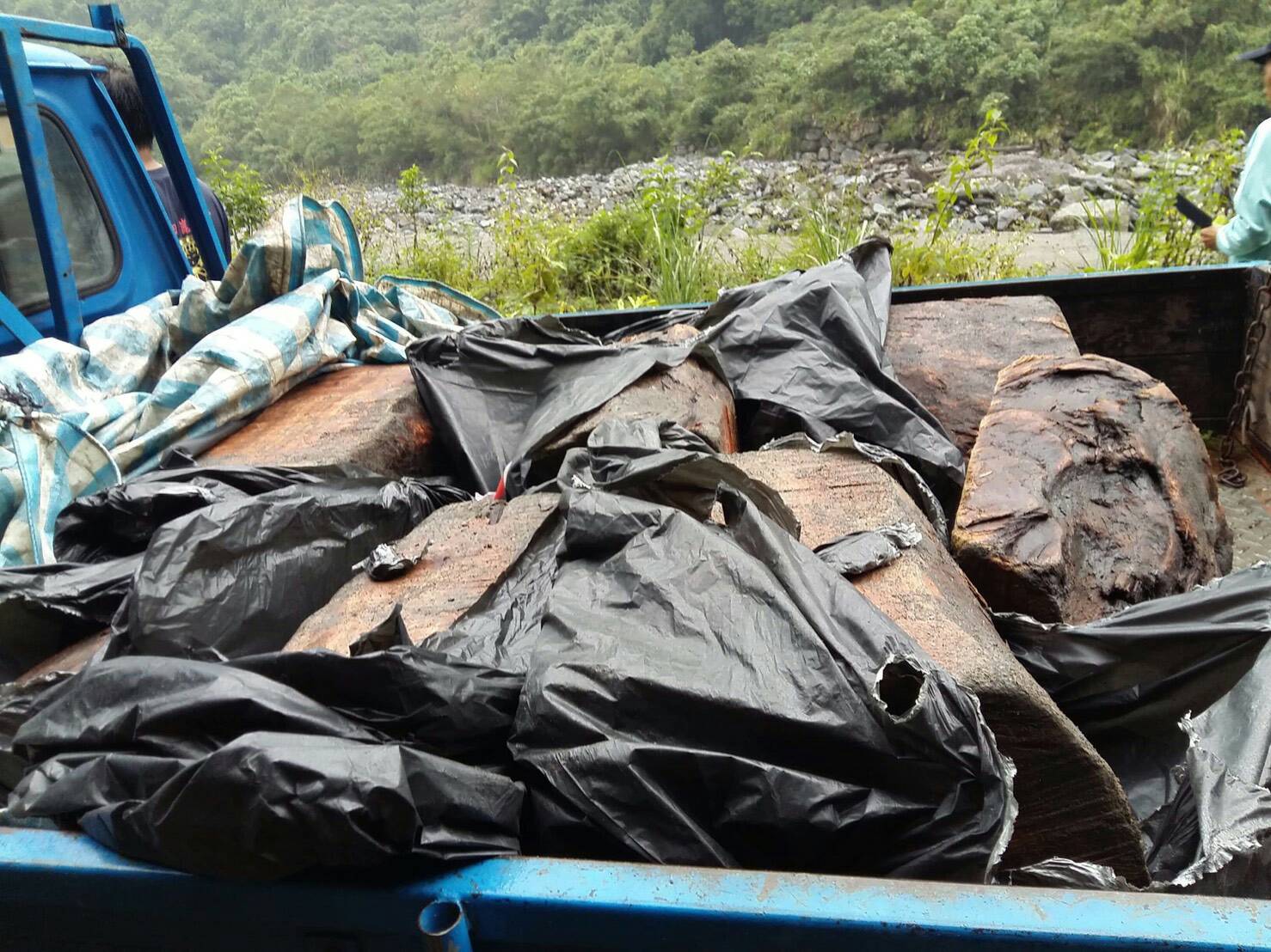 9月30日臺東林管處關山工作站會同森林警察第九大隊臺東分隊及關山分駐所員警組成聯合查緝小組前往加拿山區巡查,查獲1起非法竊取牛樟木案件,當場人贓俱獲將2名犯嫌,依森林法及竊盜罪嫌移送法辦。 林務局關山工作站接獲線報,於今日會同森林警察第九大隊臺東分隊及關山分駐所警員共同組成的查緝小組,前往加拿山區巡查,途中發現一台可疑且載滿物品的貨車,眼尖的查緝小組從車斗帆布中發現牛樟段木以黑色塑膠袋包裹,同時空氣中充滿牛樟木特殊氣味,查緝小組將即攔停該車輛,順利查獲這起非法竊取牛樟木案件,共發現鋸切牛樟木塊計8塊約355公斤,隨即將2名犯嫌,依森林法及竊盜罪嫌移送偵辦。 臺東縣關山地區森林資源豐富,又近年市面牛樟芝奇貨可居,牛樟木行情水漲船高,近年來潛入山區盜取牛樟的山老鼠鯨吞蠶食,臺東各區仍不時案件頻傳,表示市場仍有需求,因而許多宵小仍為利益,鋌而走險。臺東林管處林務人員為查緝不法,沒有假日,隨時積極巡查,因此呼籲山老鼠,勿心存僥倖。 臺東林管處呼籲民眾,若有發現可疑人士在山區出沒,請民眾協助通報轄內各工作站或警方。林、警、民聯手共同打擊不法,為保護森林資源而努力(通報專線:0800-000930,您您您救山林)。