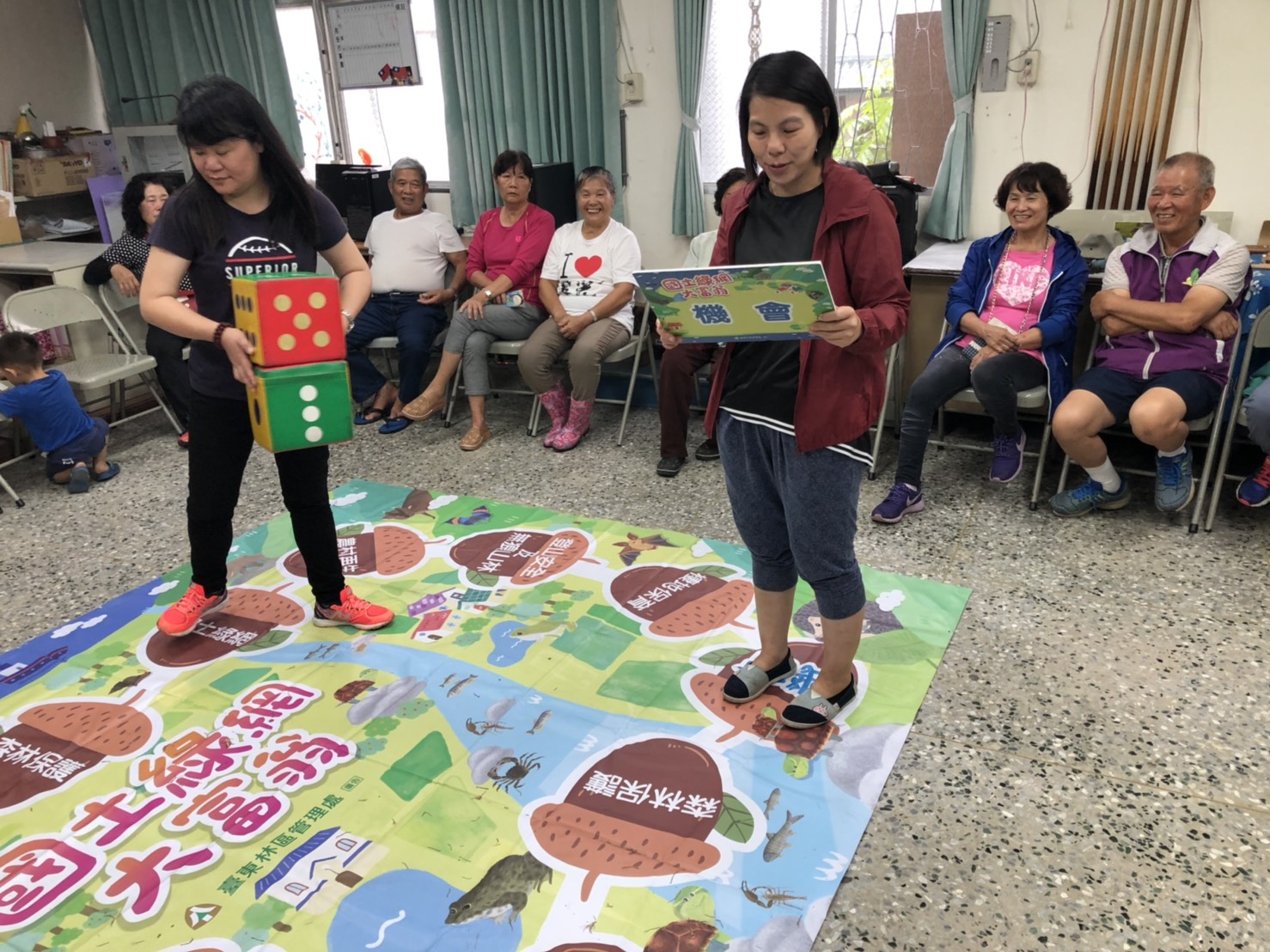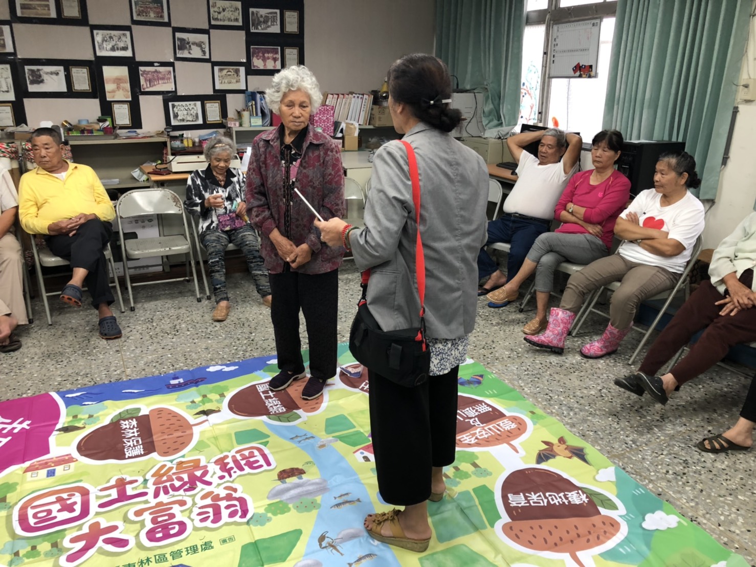 臺東林管處關山工作站自去年辦理保林、愛林、護林宣導列車,深受轄內各學校及社區的喜愛,今年同樣舉辦三場巡迴式宣導活動,與往年不同宣導方式不同,今年為豐富宣導內容,特別加入桌遊概念,推出國土綠網大型桌遊,並將國土綠網、里山倡議及打擊山老鼠等最夯的保林及保育觀念融入大型桌遊,把保林、保育宣導變有趣,達到寓教於樂的效果。 本(12)日臺東林管處關山工作站保林、愛林、護林列車,前進關山鎮電光社區,特將大型桌遊國土綠網大富翁帶到社區與阿美族長者們宣導及一同闖關玩樂,長者們在看完關山工作站技正魏瑞廷的示範後,紛紛專心投入桌遊遊戲,且各個玩的不亦樂乎。 技正魏瑞廷表示,使用設計完善又簡單有趣的大型國土綠網大富翁,非常具有意義且能夠迅速達到宣傳功能。內含9個國土綠網、里山倡議、保育及保林及保育等議題,另「機會」與「命運」卡片有常識篇、動物篇、里山篇等共60道題目無重覆,內容豐富。此外,在遊戲卡片中有題寫道「請發出三種您認識的保育類動物的聲音?」現場參與的長者們,紛紛被參與者富含創意的叫聲逗得樂開懷。