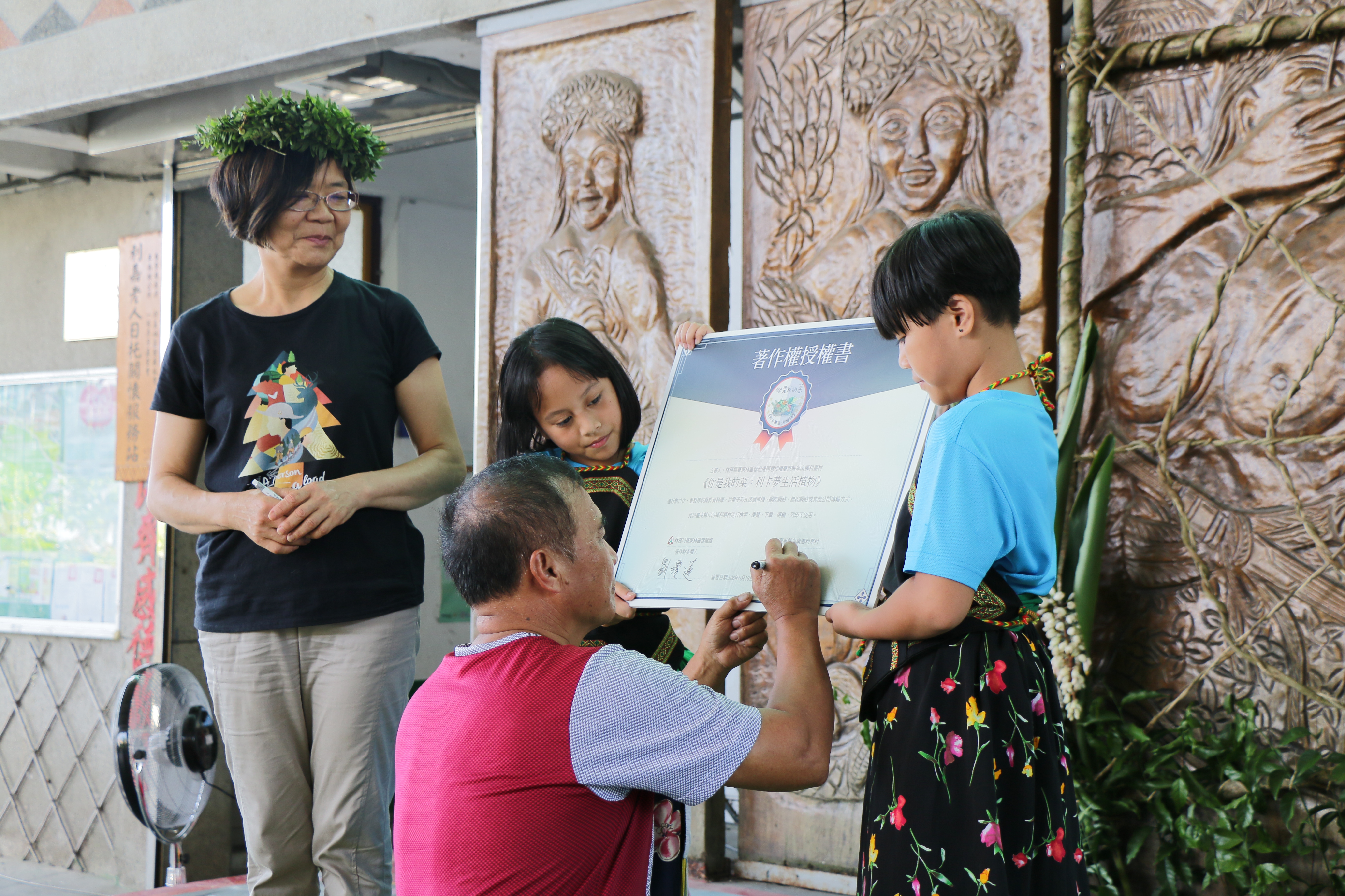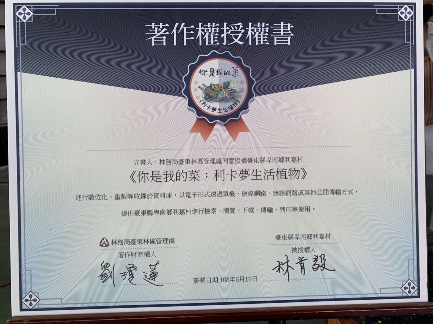山柚’alidengadeng—清涼刷牙菜。 野牡丹adas —吃了可以尿很遠的植物。 咬人貓lingatren—讓靈魂會癢到跑掉的植物。 龍葵metri—讓亮滅亮滅的雙眼恢復明亮的野菜。 排香草’asap—做花環、治頭痛,驅邪又可以拔鬼,讓魔鬼跑掉的植物。 山棕’atamur —搭工寮做掃把的材料,誤食生果會癢到想把舌頭拉出來抓。 傳承山林智慧不等人,我們不再等到失去,才去追憶緬懷mumu講過的話,我們在老人家的指引下,一步步為自己,也為孩子預備好回嘉的路。過去一年多來,臺東林管處、臺東縣永續發展學會及利嘉社區巡守隊責無旁貸地彙集利嘉在地知識,陪伴利嘉國小學生一二三年級以葉脈代筆手寫,四五六年級書寫繪製植物的日常樣貌,同時恢復植物母語名稱的《你是我的菜:利卡夢生活植物》,這本書是記錄著森林帶給我們的知識與力量,我們並試著從現代與傳統的角度,重新認識與詮釋予花草、樹木原始與文明的個性。 今天,臺東林管處結合利嘉國小畢業典禮,熱熱鬧鬧地公開發表《你是我的菜:利卡夢生活植物》的書和DVD,這是利嘉部落老中小三代傳承記錄55種生活中常見的山林植物和田野蔬果的文字和影像,由5位耆老、8位中生代的巡守隊員及53名利嘉國小全體師生共同著作。這不只是一本吃得飽足的料理書,還是一本能強健身體與富足心靈的書藉,裡頭有利嘉族人世代相傳的秘密配方。我們不只留下祖先的智慧,也感受了森林裡的生命氣息,更留下傳統秩序和禁忌,透過三代共學的調查方式,讓我們不致於徘徊現代與傳統之間,反而更加有力量及勇氣使用祖先的山林智慧,亦讓長輩的心願及下一代的未來有所倚靠。 臺東林管處今日致贈本書給共同參與書寫的五位畢業生,期盼他們繼續帶著部落知識的力量,飛向更美好的未來,同時臺東林管處也在此正式將紮根山林的知識權回歸給部落,讓予部落族人傳承與運用。透過這樣的行動,具體表現了「原-林」一體的精神,盼望讓更多族人找到回「嘉」的路,延續使用原來隱藏在山林裡的知識寶藏,未來並能順應自然變化重新找到與山林和諧共存的現代智慧。