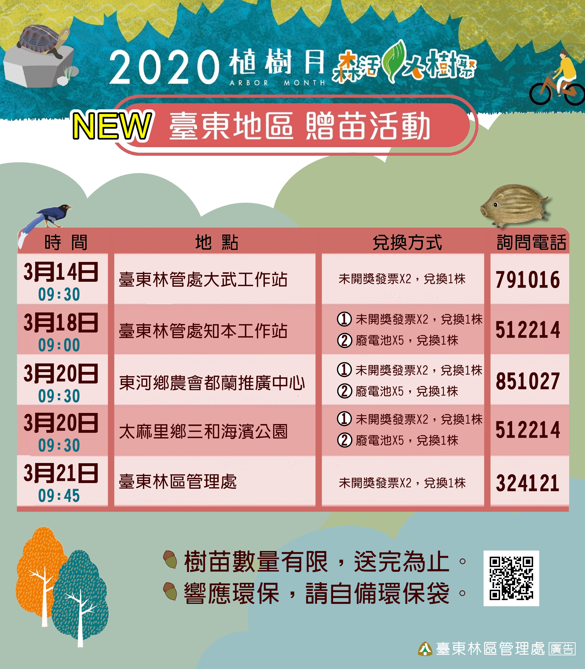 今天是植樹節,您種樹了嗎?如果還沒有,沒關係,臺東地區內還有5場次的贈苗活動,要讓民眾領樹苗綠化家園。其中3月14日及3月21日在大武工作站的市集及台東市區太平溪口的淨灘活動,因應新冠肺炎(COVID-19)的防疫需要取消,但當天仍有大武工作站及臺東林管處處本部廣場進行贈苗,贈苗的樹種全數為台灣原生種,微調為雙花金絲桃、含笑、紫薇、厚葉石斑木、七里香、臺灣赤楠、光臘樹、大頭茶、鐵冬青、毛柿、三斗石櫟、香楠、白水木、臺東石楠、臺東龍眼等原生種植物給民眾兌換。歡迎想要植樹綠化的民眾們,前往各贈苗場次兌換苗木,各場次兌換方式略有差異,詳情可參閱活動海報或電話洽詢。為響應環保,請自行攜帶環保提袋或容器領苗。 【活動洽詢電話】 臺東林區管理處089-324121(3月21日臺東市區贈苗場次) 知本工作站089-512214(3月18日知本及3月20太麻里贈苗場次) 成功工作站089-851027(3月20日都蘭贈苗場次) 大武工作站089-791016(3月14日大武贈苗場次)