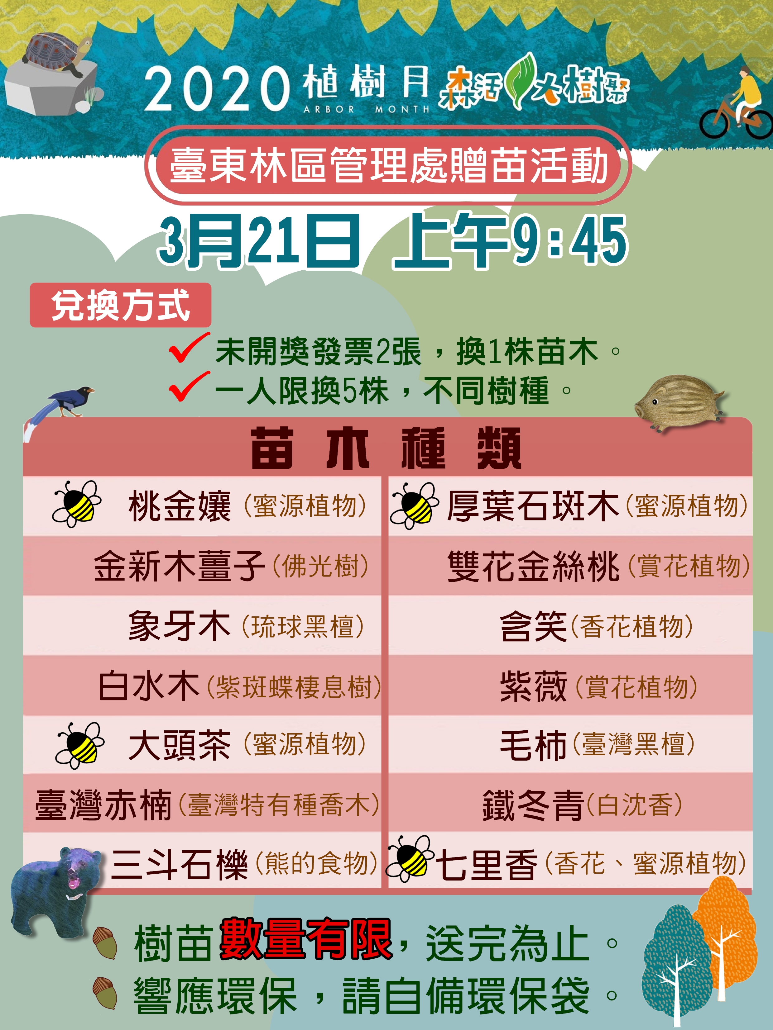 3月21日是國際森林日,今年的主題為森林和生物多樣性。為了響應國際森林日,臺東林管處於當日上午9時45分辦理贈苗活動。活動場地在林管處前廣場,民眾可憑未開獎發票2張兌換1株苗木,每次排隊限兌換5株。今年贈苗以台灣原生種為主,有可以吸引蝴蝶、蜜蜂的蜜源植物(桃金孃、大頭茶、厚葉石斑木等)、本土的香花或賞花植物(含笑、七里香、紫薇、雙花金絲桃等)、材質優良的喬木(象牙木(琉球黑檀)、毛柿(台灣黑檀)),另外還有紫斑蝶很愛的白水木跟可以結出黑熊最愛的橡實-三斗石櫟等。想要響應國際森林日、種植原生樹種的你,千萬不要錯過今年植樹月臺東地區最後一場贈苗活動唷!為響應環保,請自行攜帶環保提袋或容器領苗。