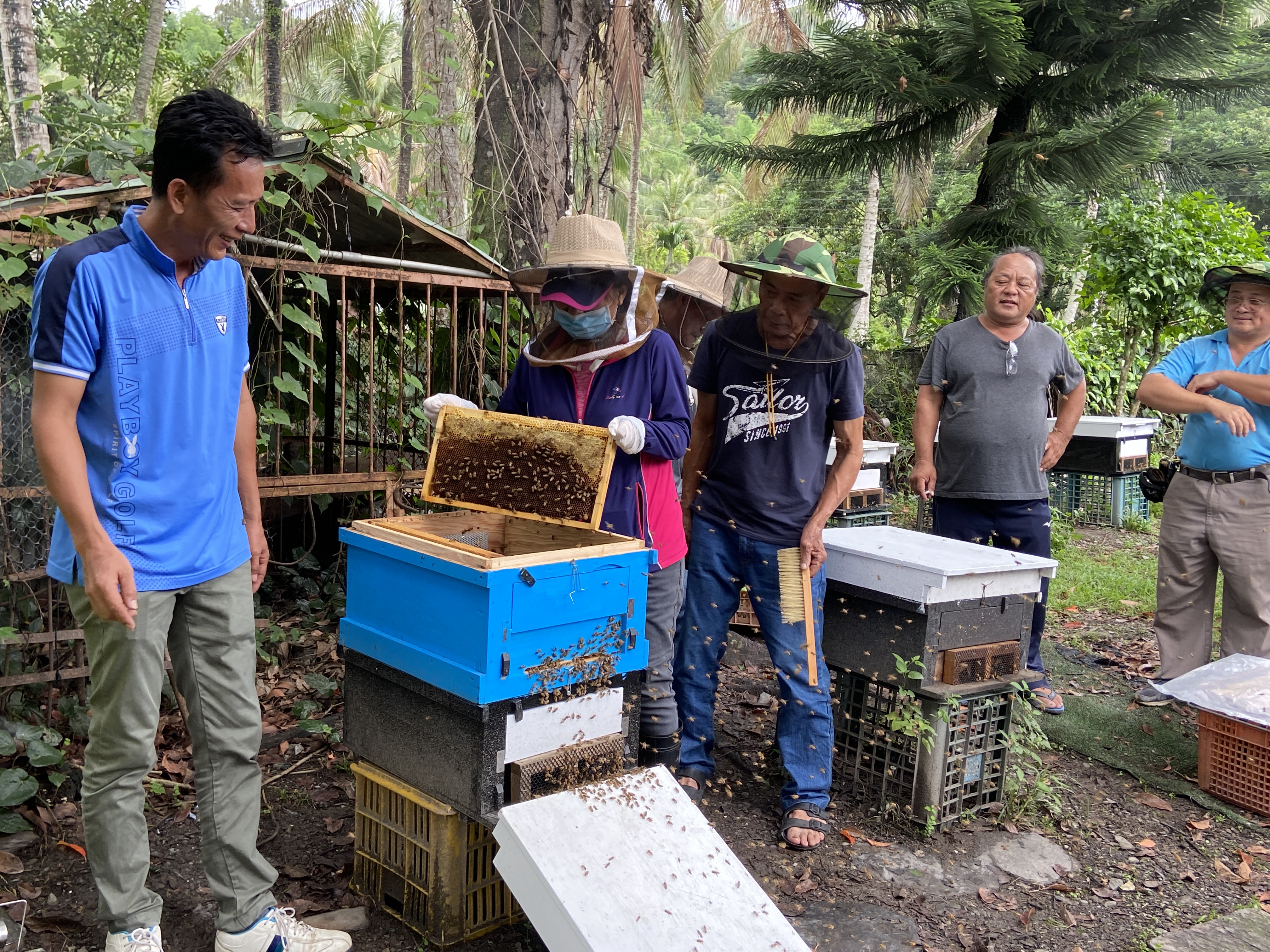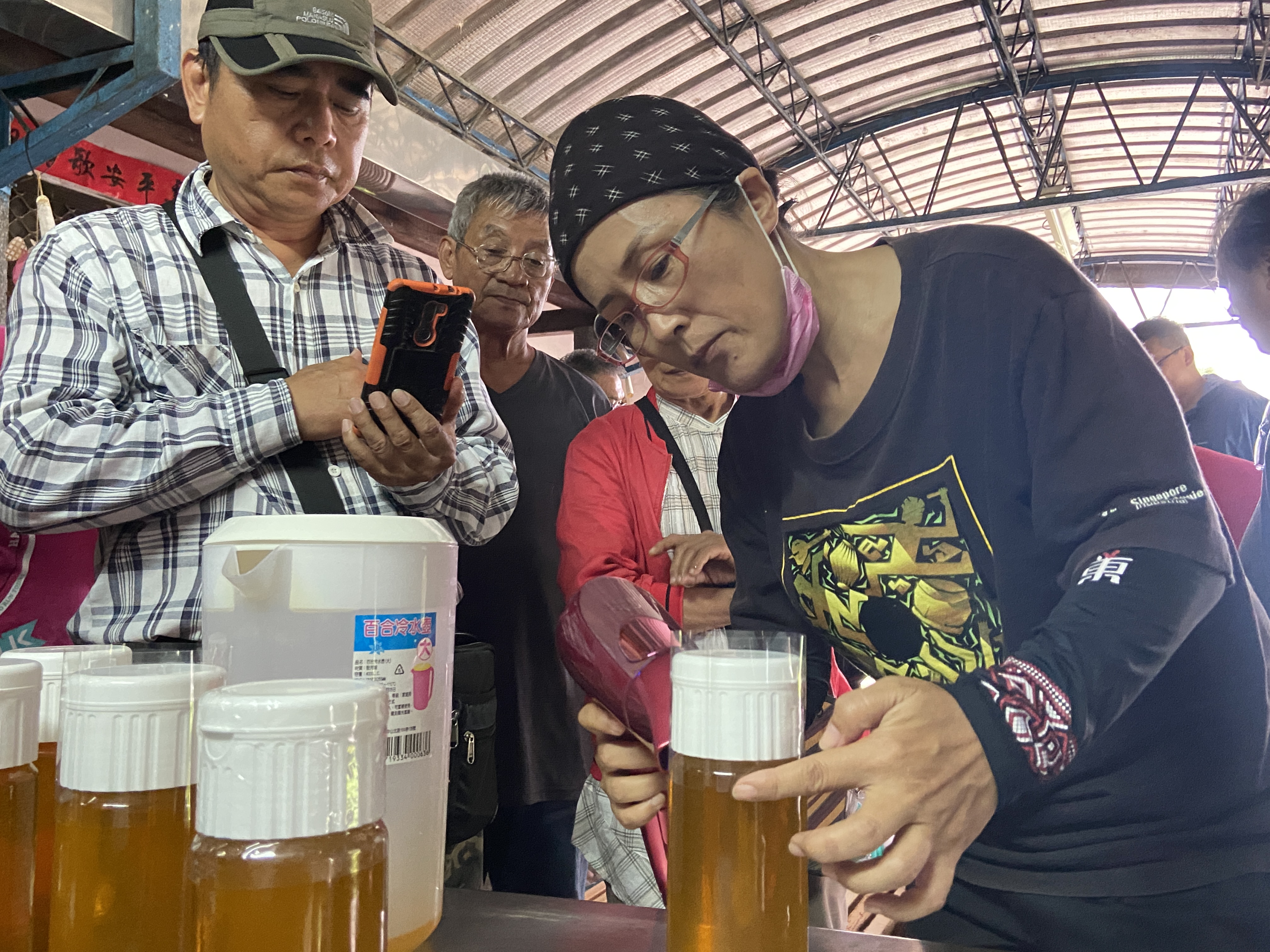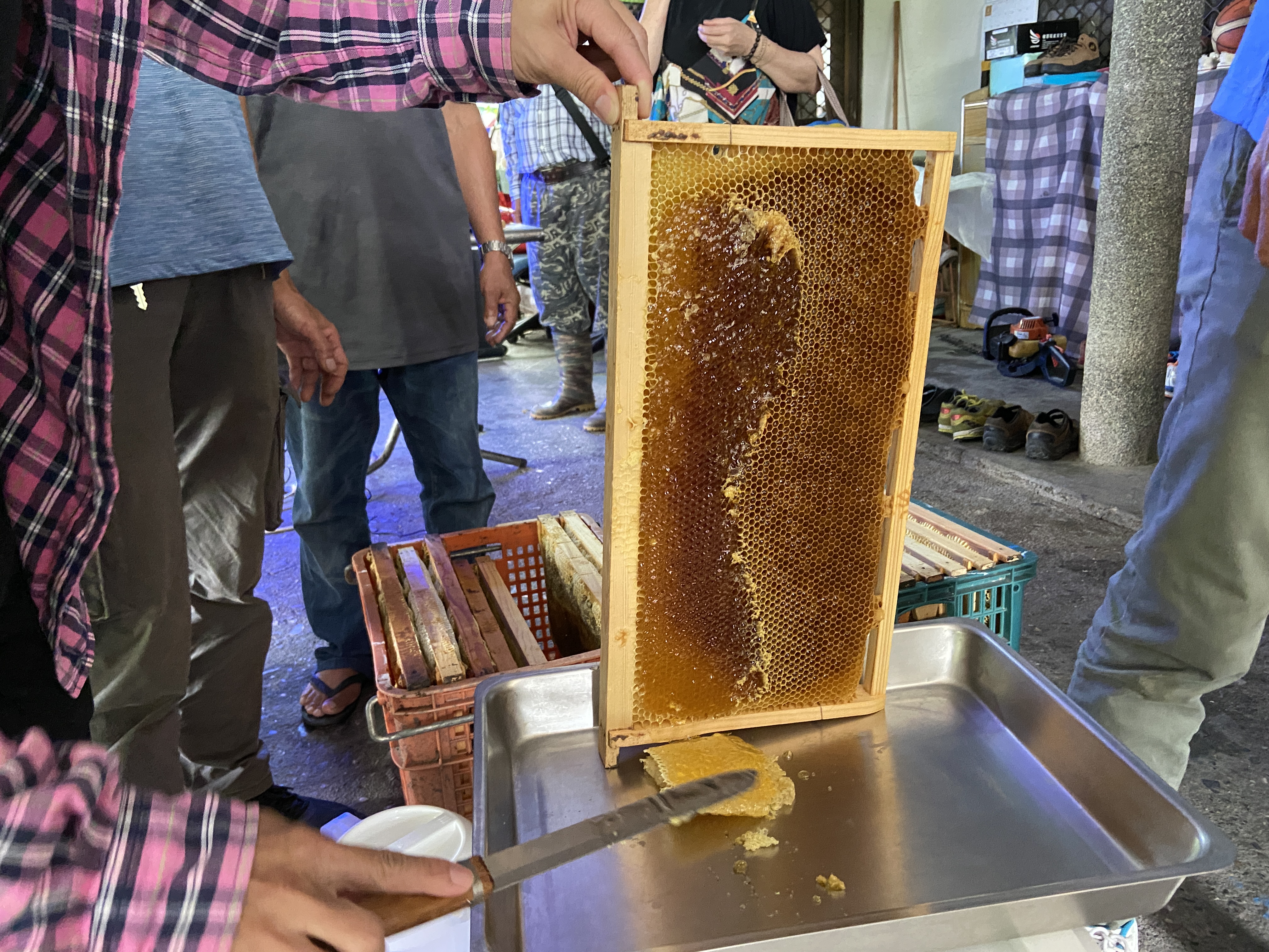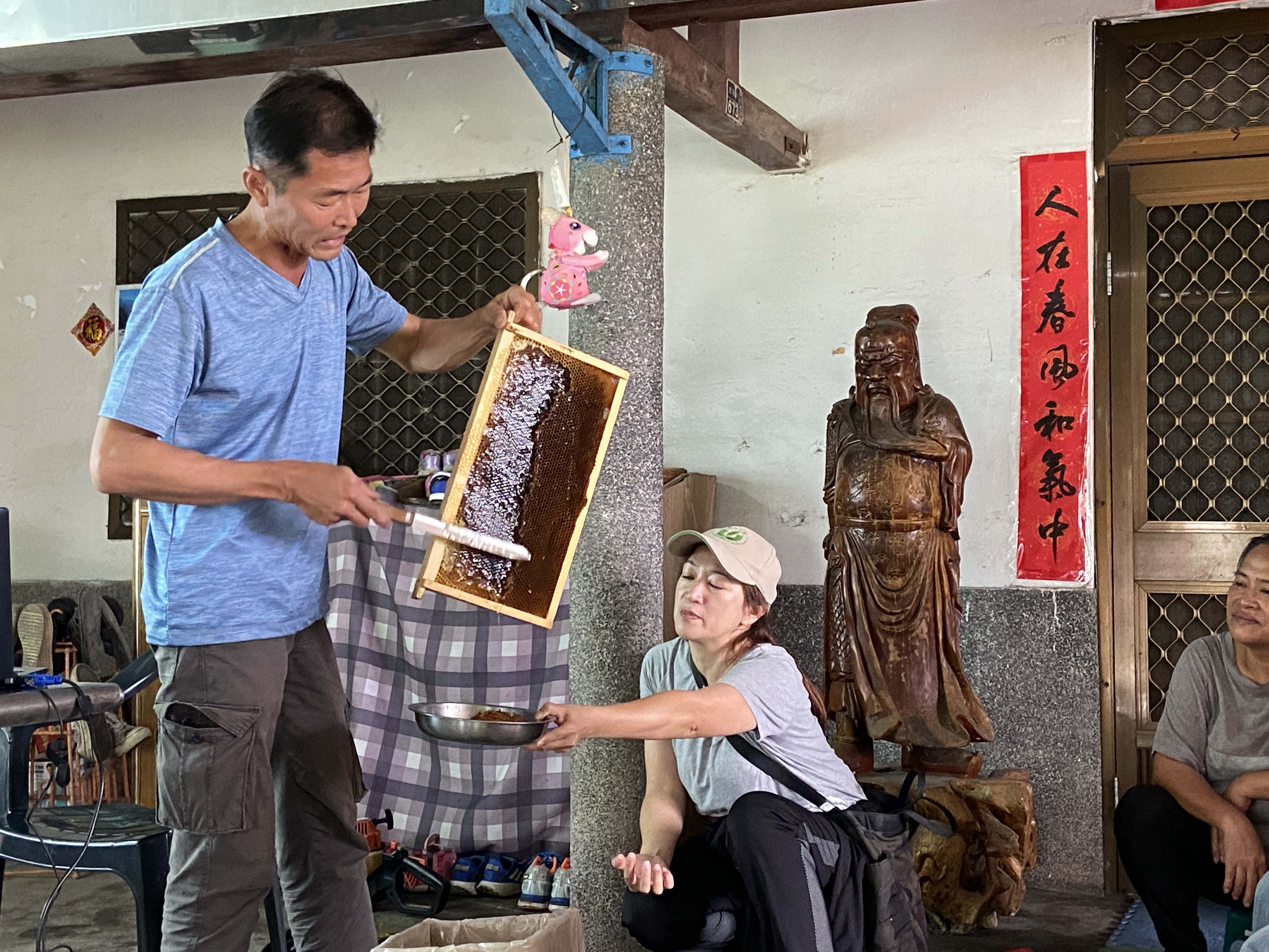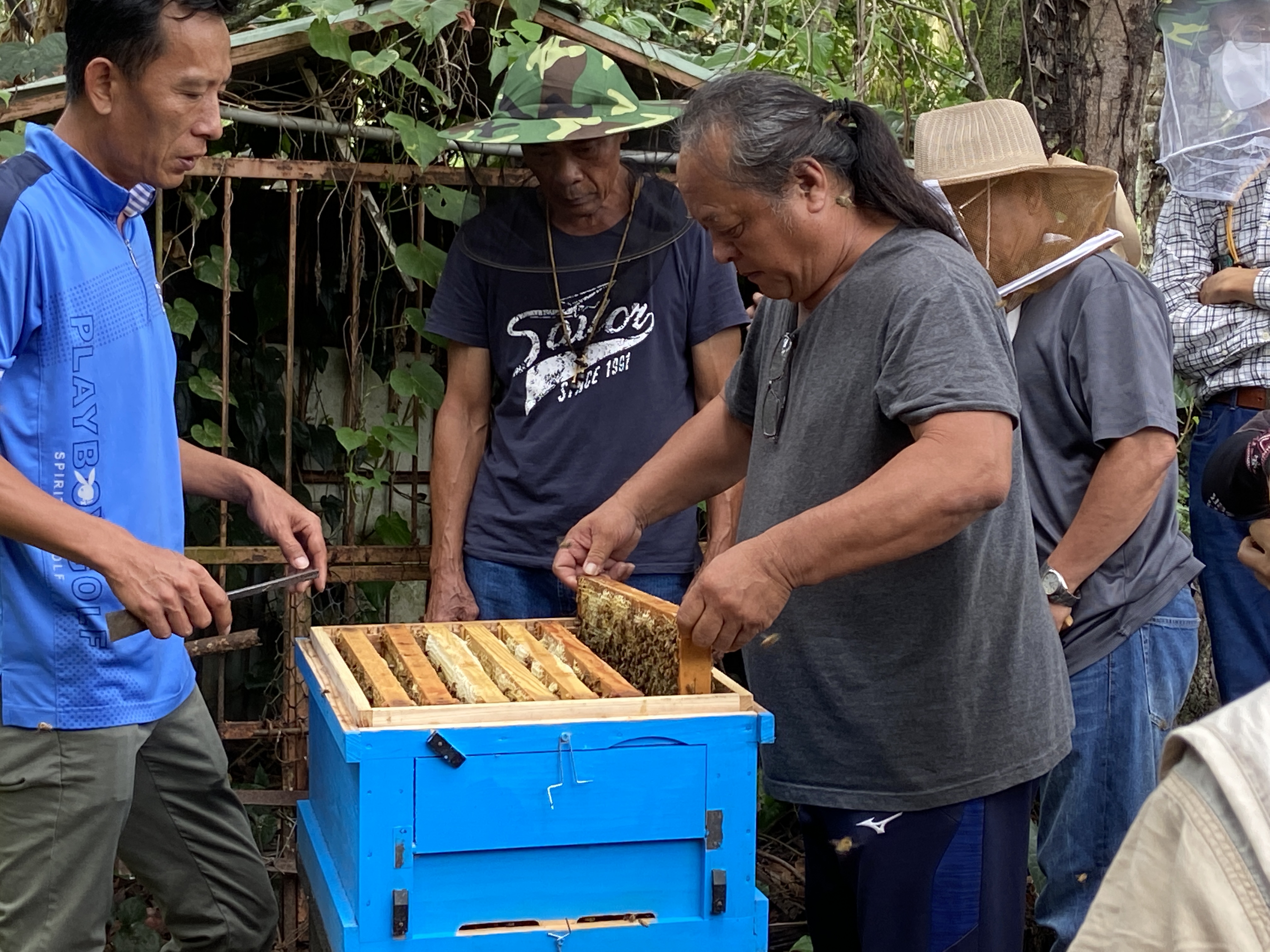 林務局臺東林管處輔導卑南鄉利嘉社區進行為期2個月的林下養蜂技術培訓課程,昨(24)日進行最後一堂課,由學員們親手採收蜂蜜,看著一瓶瓶澄黃色的蜂蜜在手中產出,社區夥伴們個個笑得合不攏嘴,林下養蜂課程第一階段也順利結業,未來也期望森林蜂蜜能成為利嘉社區特色產業。 利嘉社區參與林務局社區林業計畫-森林保護篇山林巡護工作多年,致力於森林保護、盜伐採查緝,是社區參與保育的典範,去年林務局推動林下經濟,開放林地可申請種植段木香菇及木耳、金線連、及養蜂。利嘉村林肯毅村長即向林管處表達社區居民們想學習養蜂的技術,經林管處評估後,邀請在地養蜂專家以陪伴型課程模式指導社區居民養蜂,課程時間訂在居民們較有空閒的週日上午,期間自3月1日至5月24日。 參與課程的學員從每箱2片佈滿蜜蜂的巢片與1隻處女王入門,由基礎的認識蜜蜂組成到繁殖蜜蜂,進階課程由如何人工育王至蜜蜂分群,蜂箱由剛開始的12箱增加到課程結束的33箱,5月24日是階段課程的最後一堂課,學員們動手採收自己養的蜂產品,收穫滿滿,每位學員也都初具養蜂的基本技能。 知本工作站林潤榮主任表示,利嘉社區與林務局有長期的伙伴關係,透過長期輔導及社區陪伴,了解居民對於養蜂產業寄予厚望,經評估以利嘉社區環境條件與養蜂產業結合可行性極高,未來也會持續輔導社區並媒合相關單位協助蜂產業發展,相信未來可成社區特色、創造地方綠色產業。