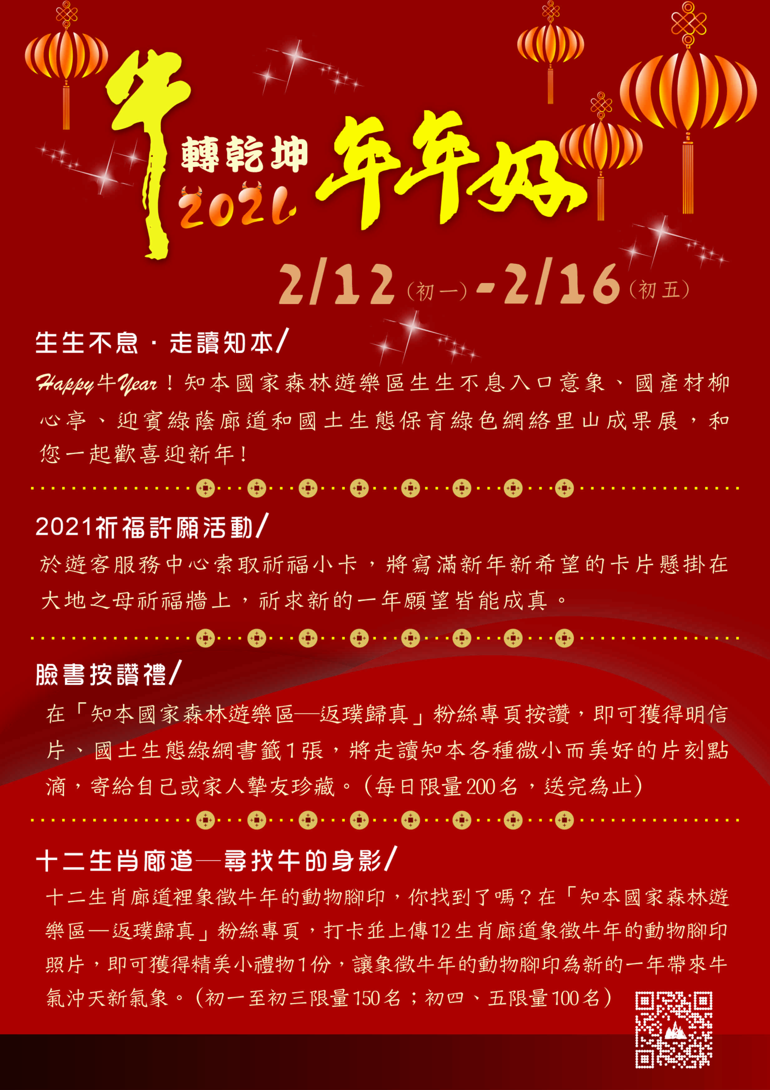 臺東林區管理處轄屬知本國家森林遊樂區,除夕當日(2月11日)休園整備,大年初一(2月12日)起恢復正常開放,園區內的七里香步道及生生不息入口意象、國產材柳心亭、迎賓綠蔭廊道等設施皆已完成,展現有別以往的全新面貌,販賣部「知森物語」也將在春節期間提供多樣輕食等餐飲服務,歡迎民眾春節期間闔家蒞臨知本國家森林遊樂區郊遊走春,體驗知性及療癒的知本! 春節期間將舉辦「2021祈福許願活動」,遊客可於遊客服務中心索取祈福小卡,懸掛在大地之母祈福區,祈願新的一年願望皆能成真。此外,還有「國土生態保育綠色網絡建置」展覽、在「返璞歸真」臉書粉絲專頁按讚,即可獲得明信片、書籤1張。在十二生肖廊道尋找象徵牛年的動物腳印,拍照上傳「返璞歸真」粉絲專頁打卡,即可獲得精美小禮物1份,讓您在新的一年好運犇來。(初一至初三限量150名;初四、五限量100名) 。 為因應新冠肺炎疫情,進行人潮分流管制措施,如園區內超過管制人數1,000人時,即啟動入園管制作業。其中,知本自然教育中心入館人數以25人為限、進入室內場館須戴口罩。多媒體播放室、展示室等暫停開放;並於售票口、遊客中心、知本自然教育中心、知森物語賣店(輕食賣店)等入口處放置酒精殺菌液噴霧供遊客使用。 臺東林管處吳昌祐處長呼籲遊客,春節連續假期知本溫泉區勇男橋、溫泉橋及知本國家遊樂區外道路將實施單向交通分流及管制,車輛請遵照交通管制方向行駛,避免造成交通阻塞。歡迎利用臺灣山林悠遊網(http://recreation.forest.gov.tw)查詢林務局所轄國家森林遊樂區、步道等相關旅遊資訊,或電洽知本國家森林遊樂區遊客服務中心089-510171#0查詢。