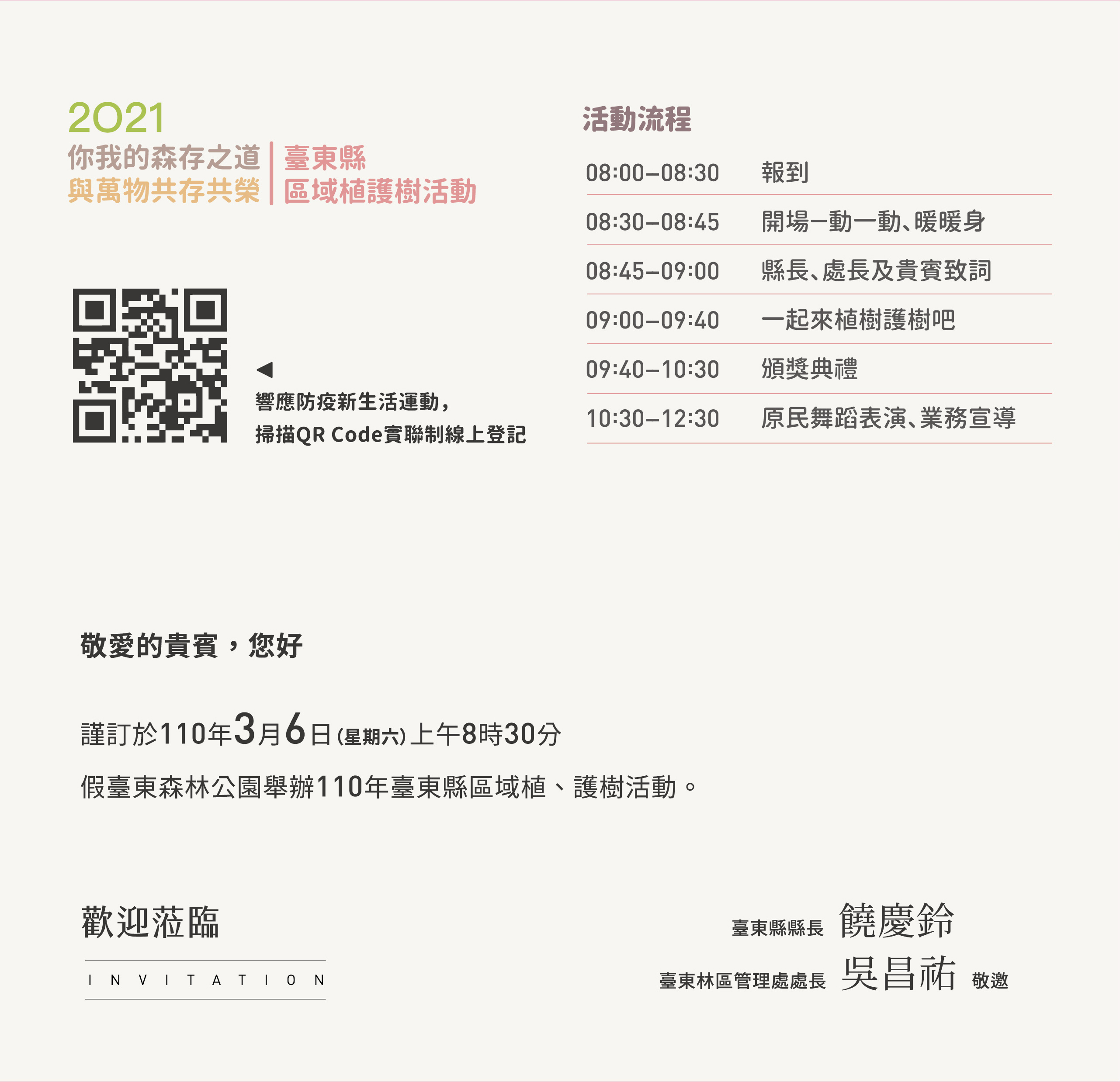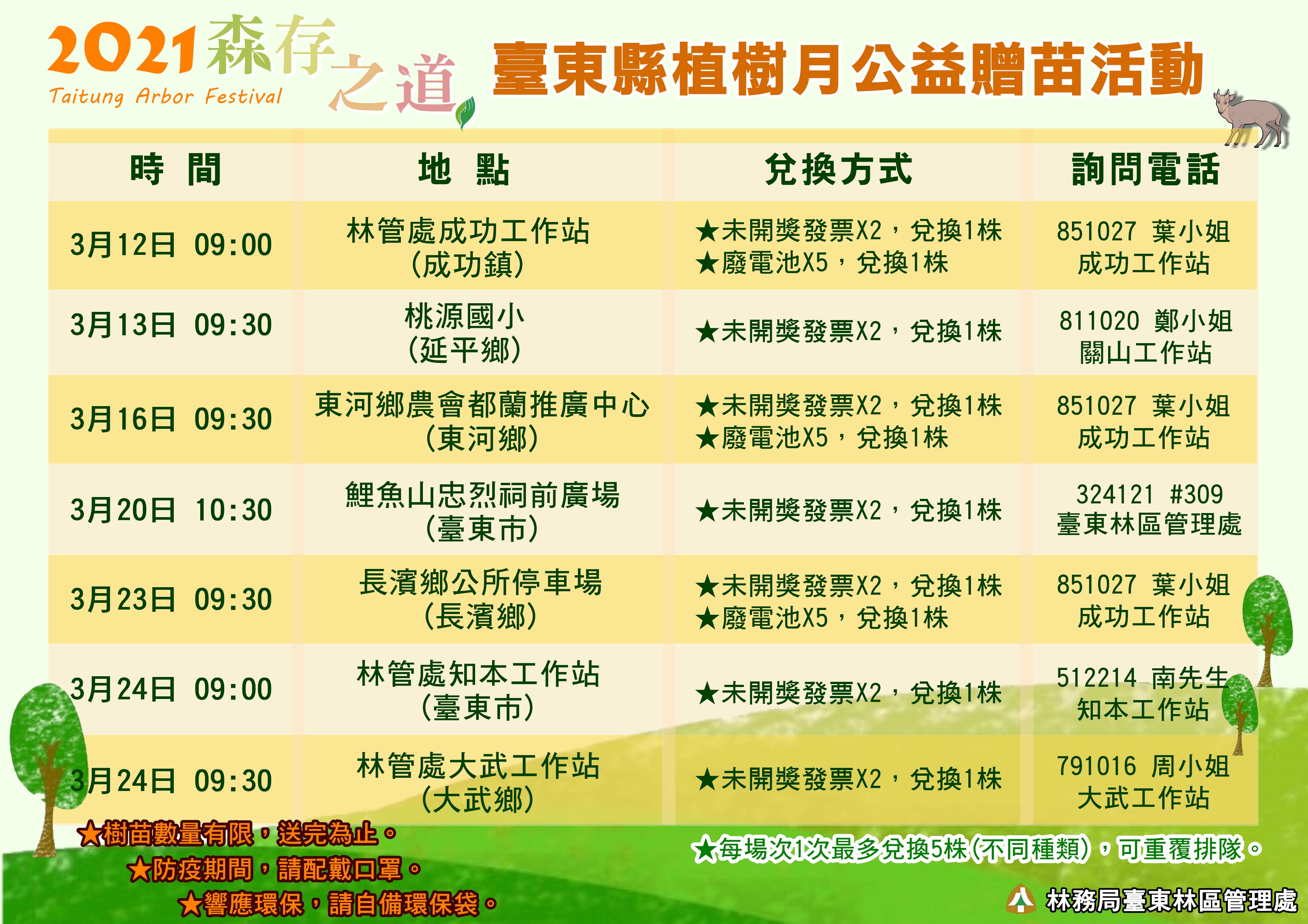 迎接2021植樹月,林務局臺東林區管理處在縣內從北至南規劃7場次的公益贈苗活動,計有25種將近11,500株的原生種苗木要讓民眾帶回家綠化。民眾可攜帶110年1至3月紙本發票至各贈苗場次兌換苗木,發票將捐贈給長期在縣內進行穿山甲保育工作的社團法人台灣穿山甲保育協會與流浪動物TNR的社團法人臺東縣關懷生命協會。 今年贈苗的種類灌木類的有:厚葉石斑木、雙花金絲桃、賽赤楠、大花赤楠、疏脈赤楠、七里香、桃金孃、鐵冬青、臺灣赤楠、含笑、紫薇等;喬木類則有:白水木、印度苦櫧、茄苳、蘭嶼羅漢松、黃連木、六翅木、毛柿、金新木薑子、象牙柿、青楓、羅氏鹽膚木、土肉桂。更多苗木生態習性、栽培資訊可自此處下載介紹資料(相關網站連結效期已過) 。響應環保及防疫新生活運動,請戴口罩及攜帶環保袋或容器領苗。 另外,臺東縣區域植護樹活動將在3月6日(周六)於臺東森林公園辦理,由臺東縣政府與臺東林管處合辦,當日上午8時20分臺東縣政府備有桂花、杜鵑、樹蘭、紅竹、矮仙丹及防蚊草3000株供民眾排隊索取。當日還有植護樹、頒獎活動,參與者須進行實聯制線上登記(相關網站連結效期已過)。 110年度臺東縣植樹月系列活動資訊 【110年度臺東縣植樹月贈苗苗木介紹網址】(相關網站連結效期已過) 【活動洽詢電話】 臺東林區管理處 089-324121 #309 關山工作站 089-811020 鄭小姐 知本工作站 089-512214 南先生 成功工作站 089-851027 葉小姐 大武工作站 089-791016 周小姐