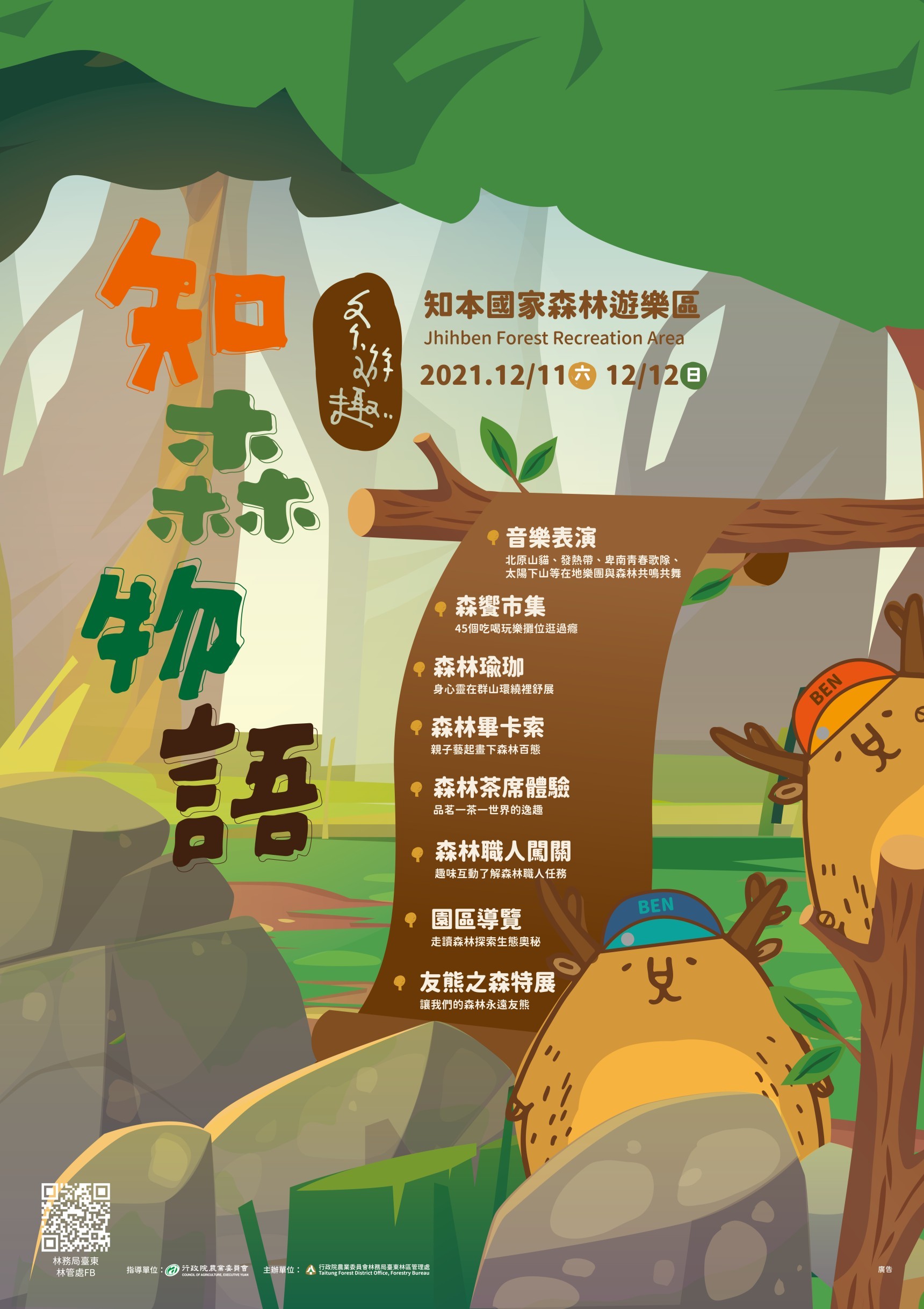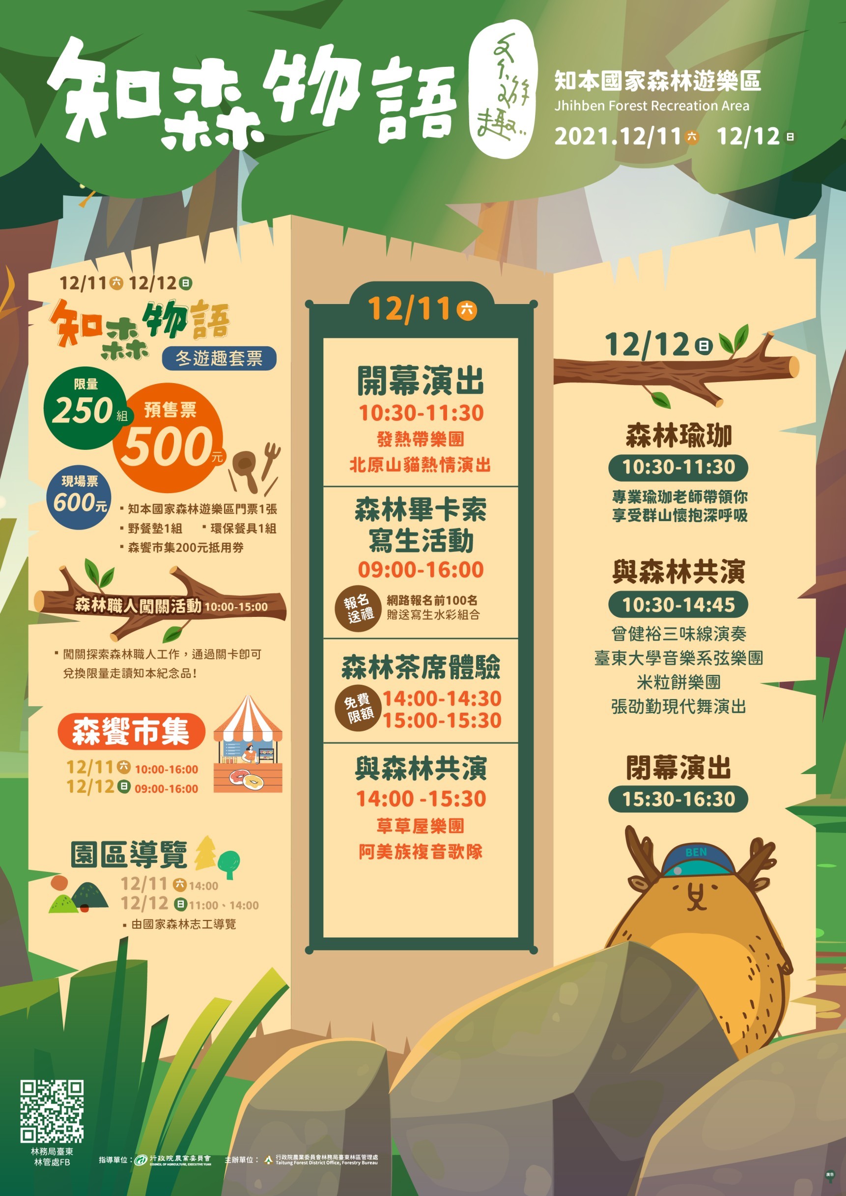 知本地區擁有氤氳的溫泉及豐富的森林生態,行政院農委會林務局臺東林管處將於12月11-12日(星期六、日)辦理「知森物語-冬遊趣」,活動結合了森林職人闖關活動、多元性的音樂展演、園區寫生和導覽、森林瑜珈、森林市集(含括特色美食、農特產及文創手作DIY系列活動)及友熊之森特展,邀請民眾來園區徜徉在森林的氛圍當中,逛市集、野餐、聽音樂,打開五感體驗尋找走讀知本森林的趣味。 同時,知本國家森林遊樂區與統一超商臺東區6家門市合作,自12月1日起邀請民眾持園區門票一起(7)來Café活動,只要持園區門票至統一超商指定店面消費滿額即可獲手繪風明信片、筆記本(書)等好禮與咖啡。此外,為了讓民眾體驗國產材與生活接軌的多變應用,臺東林管處今年與3家策略聯盟飯店─東台溫泉飯店、知本老爺酒店與金聯世紀酒店合作,依各飯店大廳空間、運用國產材分別設計了「閱森」、「品森」、「遊森」三個國產材商品專區與疊疊樂遊具等,讓遊客體驗國產材的多元應用與融入生活的趣味及結合生活美學的展現。 12月11日(週六)開幕音樂會特別邀請北原山貓、發熱帶等表演團體為活動開場;閉幕演唱則有卑南青春歌隊、太陽下山等精彩演出;開幕當日設置森林茶席讓民眾在群山環繞中體驗品茗的逸趣。二天活動安排了展現在地特色產業的多元「森饗市集」,同時也邀請了45個含括了美食、工藝、文創與旅遊的各類達人現場設攤,在森林中吃喝玩樂一次滿足。「不插電演出」則是別出心裁在園區多處安排二胡、三味線、弦樂、吉他、歌唱及舞蹈等呼應自然生態的演出,民眾循著優美旋律走讀園區。跟著瑜珈老師在大自然中忘憂靜心,隨蟲鳴鳥叫恣意伸展身體、釋放壓力。「森林畢卡索寫生活動」讓小朋友用彩筆自由創作,記錄對森林的印象,並舉辦作品網路人氣票選,獲獎者有機會獲得知本3家策略聯盟溫泉飯店提供的住宿/溫泉/餐券等好禮。 臺東林管處處長吳昌祐表示,知本國家森林遊樂區擁有一片海拔125-550公尺的熱帶季風林,孕育了相當多元的動植物生態,有臺東龍眼、臺東火剌木、白榕、桃花心木等組成熱帶植被及林相,以及水鹿、山羌、穿山甲、黃喉貂、朱鸝、烏頭翁等哺乳動物、鳥類等。本次活動營造園區成為一座兼具知性、感性與趣味的森林藝文育樂場域,邀請大家一起走入園區感受森林的療癒力。同時也特別發行限量的「一日套票」,讓民眾深度體驗園區的魅力,一票玩過癮。 「知森物語-冬遊趣」活動一日套票定價$600包含園區入場券、環保餐具組、野餐墊及200元森林市集抵用券,套票市值超過$1000元,早鳥價只要$500元,相當物超所值,可上網預購或到臺東故事館購買,活動當天也能在園區入口買到。 #購票資訊: ▇實體販售點:臺東故事館(臺東縣臺東市博愛路478號)、知本國家森林遊樂區售票口 ▇線上販售:請鎖定粉絲專頁公告訊息 林務局臺東林管處粉絲專頁: https://www.facebook.com/TaitungForestGov/
