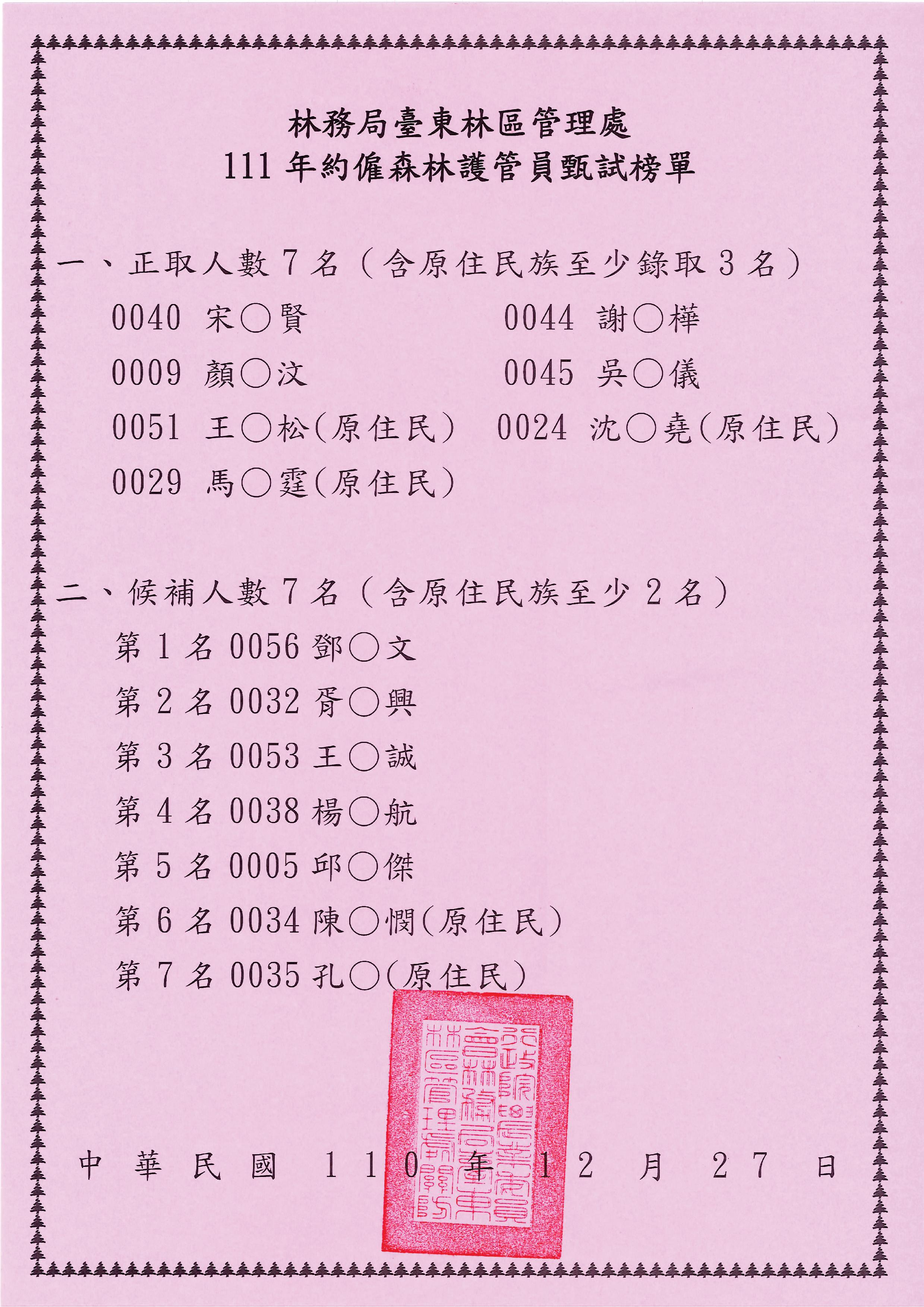 林務局臺東林區管理處111年約僱森林護管員甄試於今(27)日放榜,本次考生計有65人,到考55人,到考率84.62%,錄取正取7人(候補7人),錄取率12.72 %,其中原住民3人,占總錄取人數42.86%,女性錄取人數2人,占總錄取人數28.57%。本次正取的7位約僱森林護管員,平均年齡30歲,最年長者39歲,最年輕者24歲,值得一提的是其中有兩位女性考生巾幗不讓鬚眉的完成了循環檔機車騎乘、負重跑走、筆試及口試等關卡並脫穎而出。 臺東處吳昌祐處長表示,睽違23年後首次自辦招考,在臺東監理站、臺東縣立東海國中的協助及同仁們的努力下,甄試順利圓滿,昨(26)日完成甄試隨即核算成績確認錄取名單,新進森林護管員自報到訓練起即支領月薪30,030元,晉用後依每年各等專業訓練合格及年終考核成績情形逐步晉報酬薪點,最高可晉級至約僱五等330 薪點,每月薪酬45,045 元,另依實際執行山地巡護勤務情形,每月得支2,000元至5000元不等的山地巡護作業費。 錄取的約僱森林護管員將於明(111)年1月17日統一報到,為使這批生力軍具備護管員基本專業素養、充實實務知識與了解林務局重要政策,後續已規劃一個月充實的學科與術科訓練,相信經過課程洗禮後,未來必能為保護山林、查緝盜伐、濫墾等國土保育工作有所貢獻。