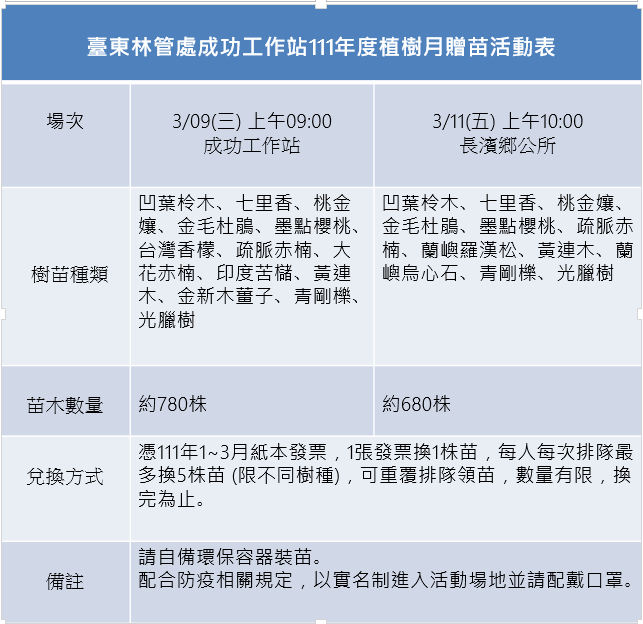 配合植樹月,臺東林區管理處成功工作站將分別於3月9日上午9時於成功工作站;3月11日上午10時於長濱鄉公所舉辦贈苗活動,歡迎鄉親逗陣來參加。 今年將提供15種原生樹種苗木,如花色艷麗的金毛杜鵑、葉片在光照下能閃爍金光俗稱佛光樹的金新木薑子、還有本土原生柑橘類的台灣香檬等等,兩場次活動合計將準備1,430株苗木供民眾領取。 林木可藉由光合作用捕捉大氣中的二氧化碳並固定在植物體內,在碳循環過程中扮演減碳的角色,妥善經營森林可提升森林的碳匯能力。臺東林管處鼓勵民眾栽植合適在地環境的原生樹種,回家種一棵樹,送給下一代禮物,讓大家一起參與這場碳循,共同為環境綠化及減碳目標努力。 民眾可憑111年1至3月紙本發票兌換苗木,1張可兌換1株樹苗,每人每次排隊可領5株(限不同樹種),可重覆排隊領苗。為響應環保,現場不提供塑膠袋,請民眾自行攜帶環保袋或容器領苗。