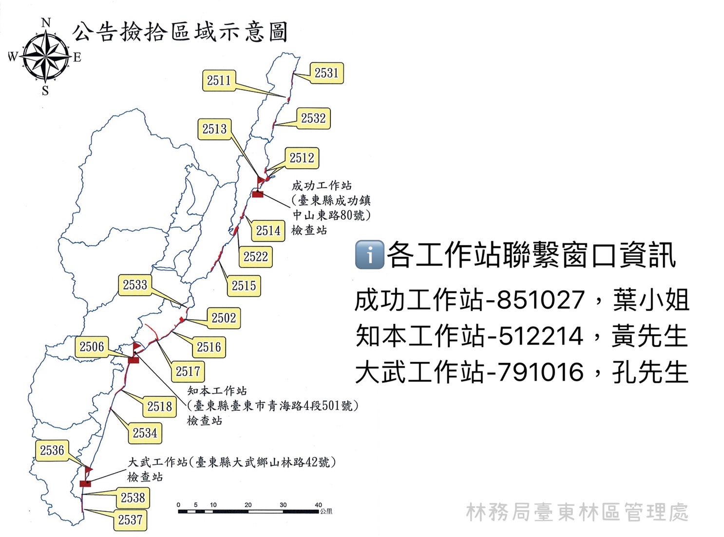 臺東林區管理處自111年08月08日至交通部中央氣象局發布下次陸上颱風警報或豪雨特報(範圍臺東縣)為止,期間開放轄管海岸地區保安林範圍之漂流木,民眾可徒手方式自由撿拾,但不開放使用機具;開放漂流木自由撿拾期間,將於轄管知本工作站、成功工作站及大武工作站等3處設置林產物檢查站(詳如附圖),請民眾將撿拾的漂流木到指定地點之檢查站辦理登記。 漂流木開放自由撿拾期間,請民眾配合撿拾的漂流木不得裁切,且須符合末徑小於20公分、長度2公尺以下,或重量50公斤以下,無國有、公有、私有註記或烙印,若屬森林法第52條第4項所訂定之貴重木紅檜、臺灣扁柏、臺灣肖楠、臺灣杉、巒大杉(香杉)、南洋紅豆杉(臺灣紅豆杉)、櫸(臺灣櫸)、烏心石、牛樟、臺灣檫樹、黃連木、毛柿等,須逐支登記,非貴重木可整批重量計列,請民眾完成撿拾後攜帶身分證件,主動到林產物檢查站辦理登記,領取拾得漂流木搬運登記表,保障所拾得漂流木所有權;如需以車輛載運徒手撿拾的漂流木,車輛規格以3.5噸(含)以下為限,並請不要覆蓋斗篷或帆布等,方便辦理檢查及登記。 民眾在撿拾漂流木時,如漂流木上有國有、公有、私有註記或烙印者,請通報當地林管處或縣市政府運回保管,後續將依民法第八百十條拾得漂流物規定,給予林產物價金十分之一做為報酬。所拾拾的漂流木除自用外,如要販賣則請民眾務必到「臺灣林產品生產追溯系統」( https://qrc.forest.gov.tw )申請登記,並取得追溯條碼後再行販售,同時也鼓勵民眾購買木製品認明台灣木材標章,共同響應及支持合法國產木材。 最後,臺東林管處特別呼籲民眾,如發現有擅撿漂流木或載運貴重漂流木之不法情事,請撥打24小時通報專線臺東縣民服務專線1999、林務局0800-000-930或撥打110報案,讓我們一起攜手共同保護國家資產。