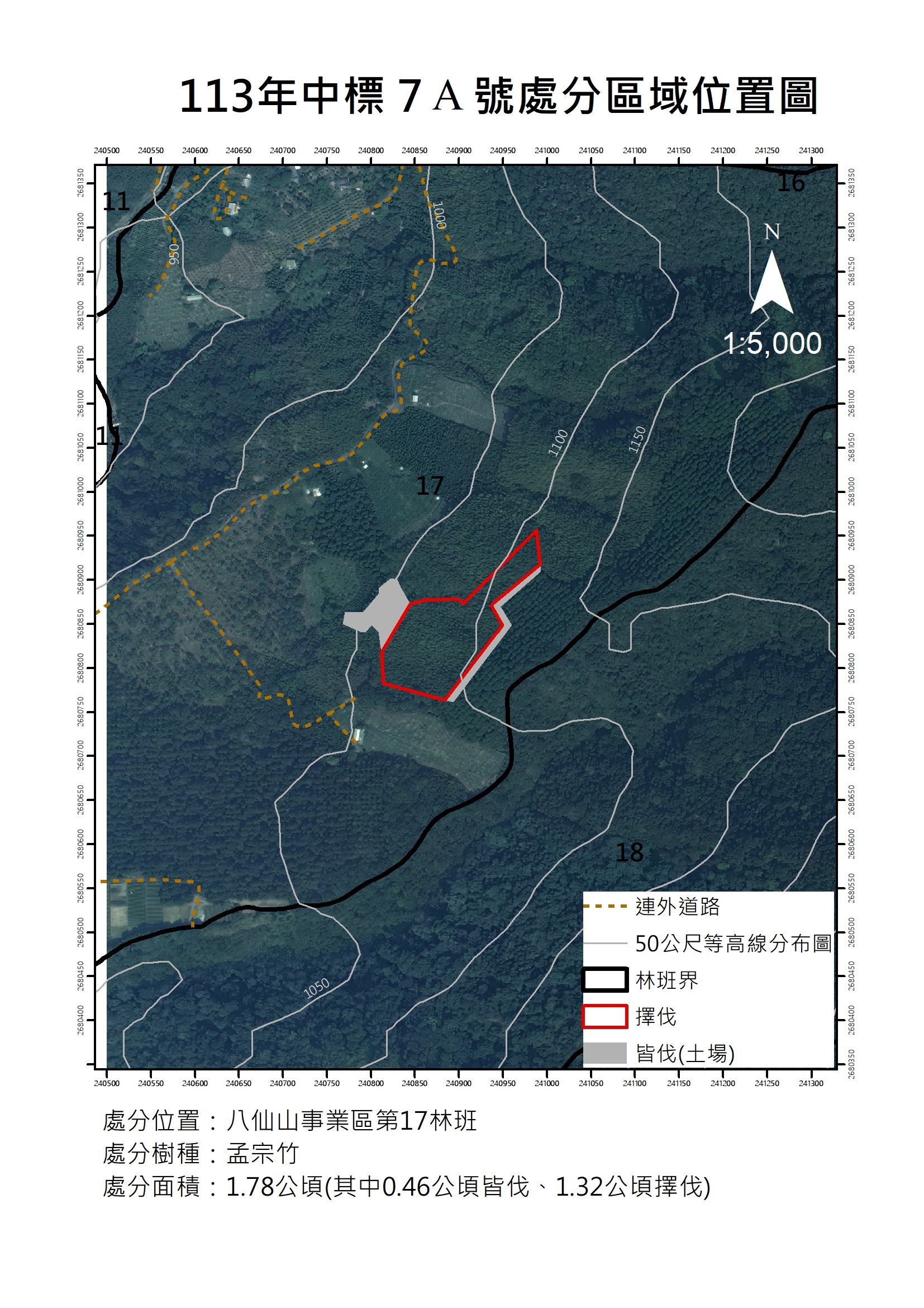 (三)材種、作業方式及及處分面積:孟宗竹,擇伐1.78公頃,處分支數9502支。