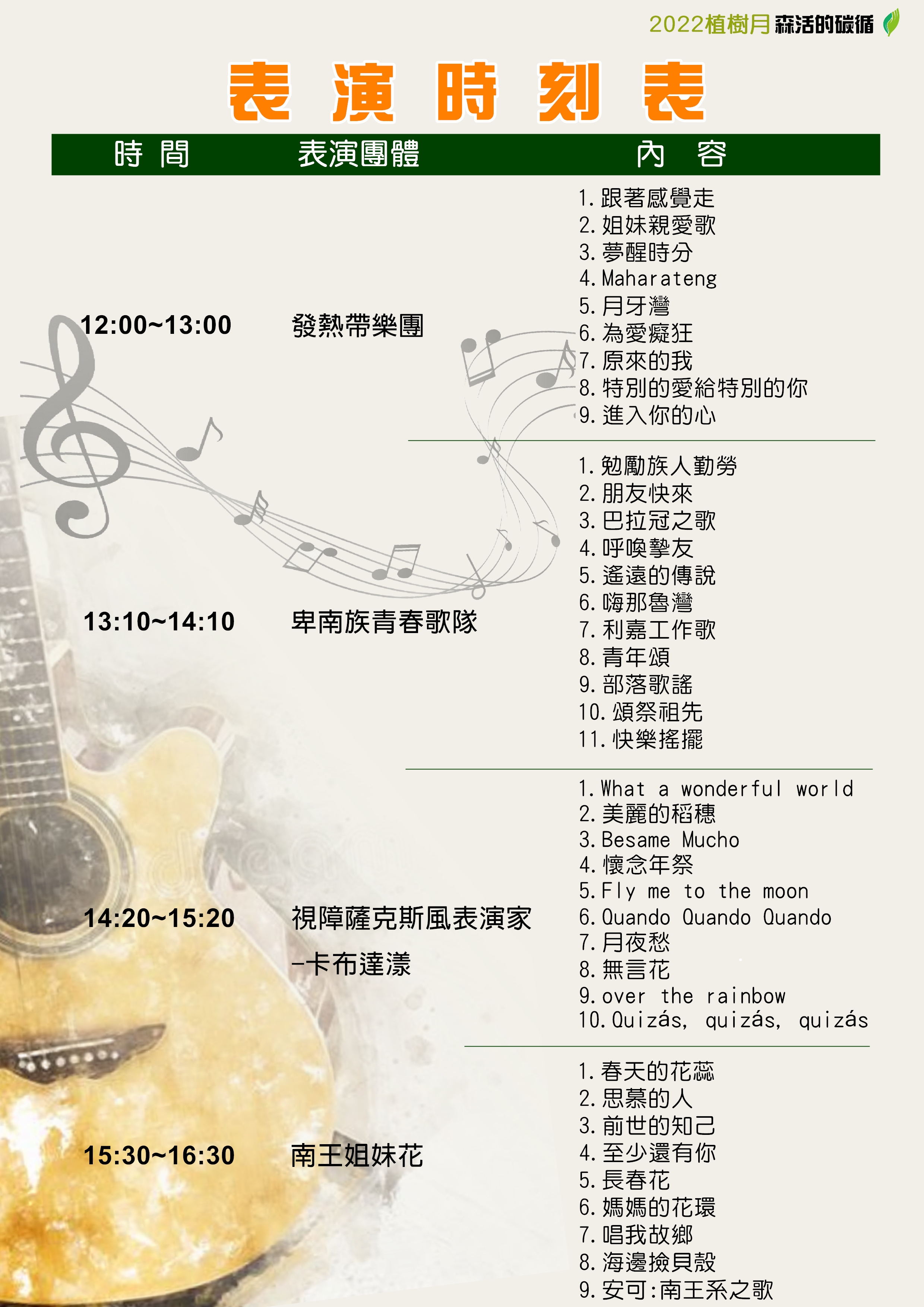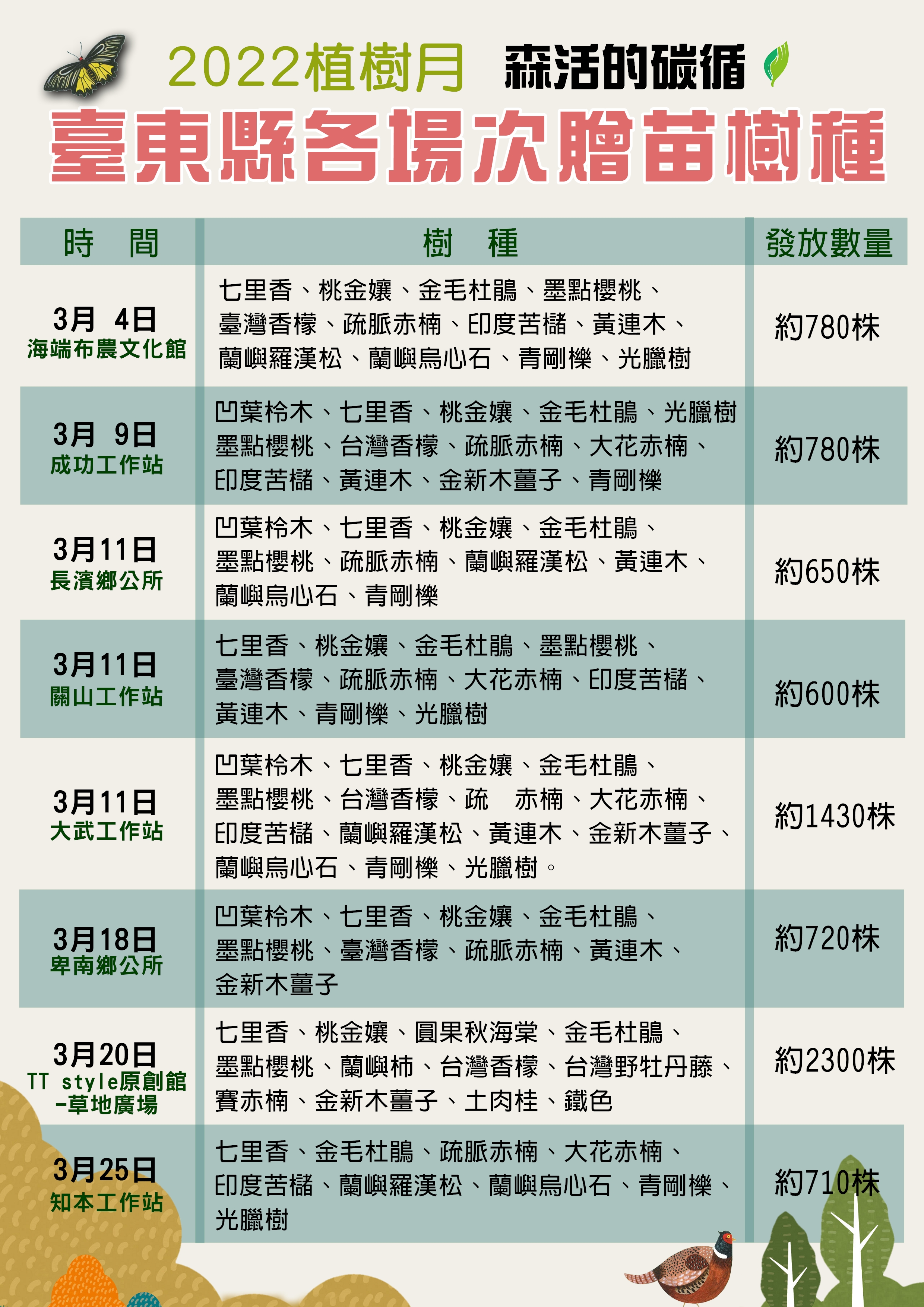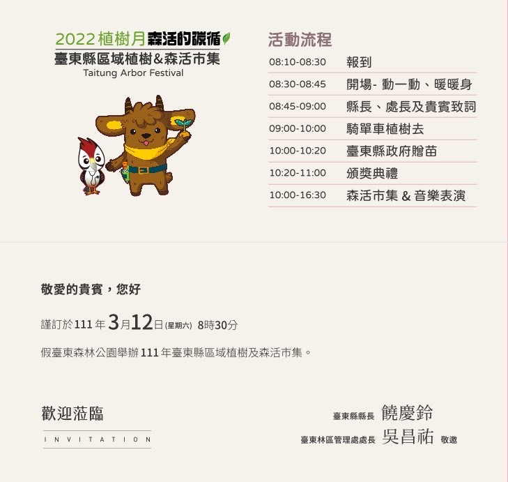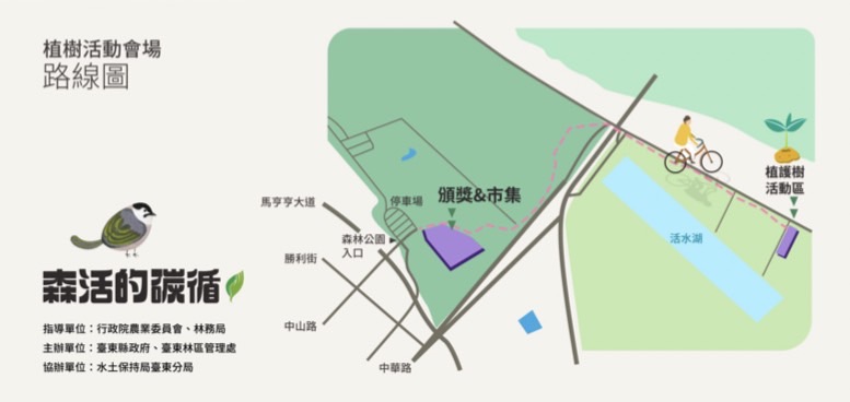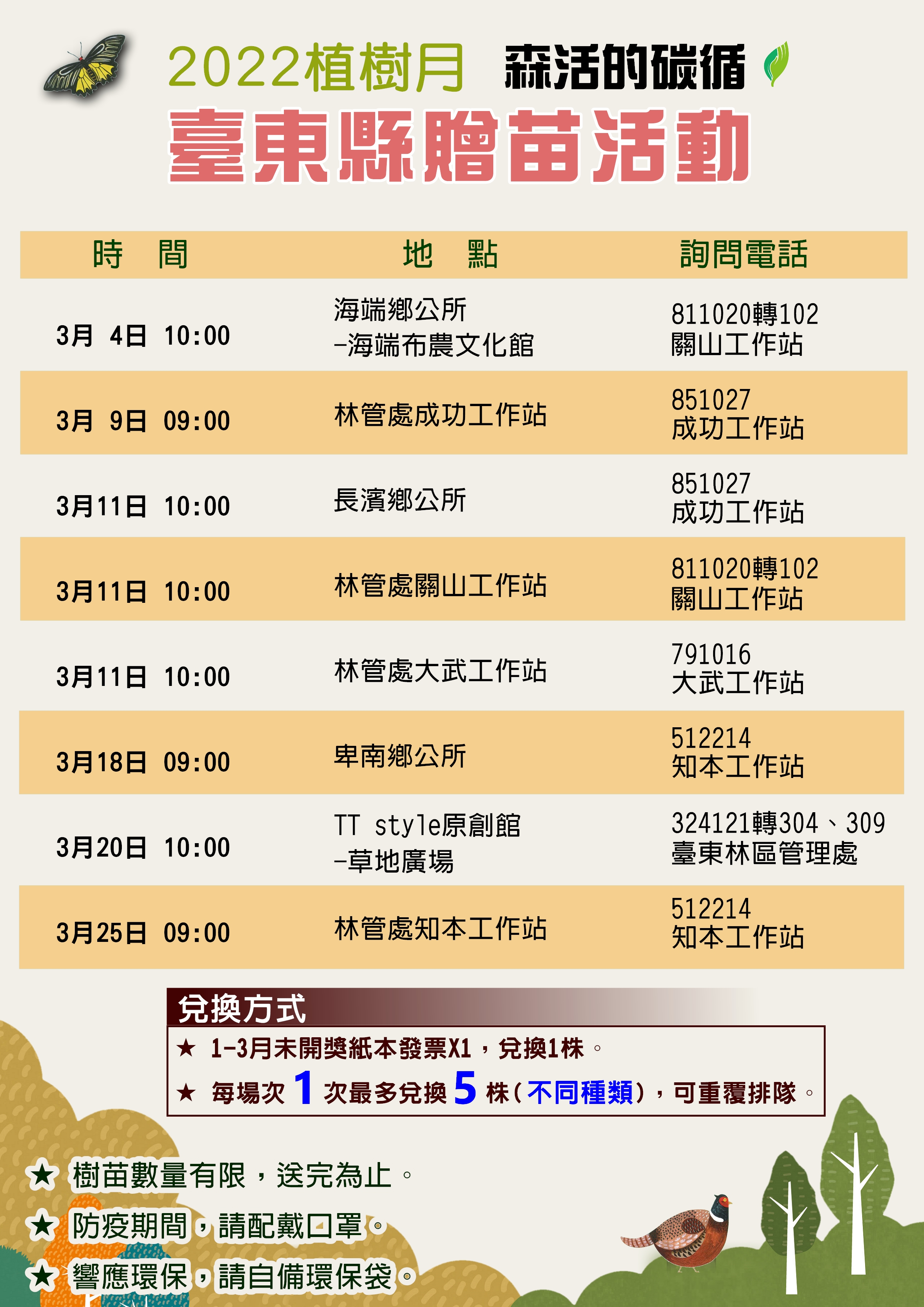 2022植樹月開跑,配合今年植樹月的主題「碳吸存」,林務局臺東林管處規劃了8場次的贈苗活動,計有21種7,970株的臺灣原生種苗木要讓民眾用紙本發票兌換,在推廣栽植原生種苗木綠化生活空間外、也增加碳吸存。今年贈苗的樹種包括:凹葉柃木、七里香、桃金孃、金毛杜鵑、金新木薑子、墨點櫻桃、臺灣香檬、黃連木、光臘樹、鐵色、疏脈赤楠、大花赤楠等,也有3種以蘭嶼為名的苗木,如:蘭嶼柿、蘭嶼羅漢松、蘭嶼烏心石;另外,也有林下經濟段木樹種,如:印度苦櫧、青剛櫟等。各場次贈苗種類略有不同,詳細資訊可點閱 https://reurl.cc/zModXy (記得從表單選擇縣市,即可瀏覽該縣市贈苗場次完整資訊)。為響應環保,請自行攜帶環保提袋或容器領苗,並請遵守防疫規定並配戴口罩。 由臺東縣政府、臺東林管處及水土保持局臺東分局合辦縣內最大場區域植樹及森活市集預計將在3月12日(周六)於臺東森林公園辦理。當日除了植樹與頒獎外,上午10時臺東縣政府備有自行培育的苗木及金城武樹(茄苳)小苗要讓民眾排隊索取。10時至16時30分的森活市集,除了有音樂表演外,也邀集了國產材(公東高工、向陽薪傳木工坊)、林下經濟(段木香菇、森林蜜等)、環境教育、友善農作等特色攤位,另外也有微光集、2626市集、公益團體及手作、文創、美食等攤位設攤。當日市集消費滿額可兌換苗木、洗碗精、黑熊三折帽、森活風胸章等禮品(數量有限,換完為止),周末記得一起走出戶外、享受森活好時光。更多活動詳情請搜尋:林務局臺東林區管理處Facebook粉絲專頁。 臺東林管處及所屬各工作站轄內,辦理了8場次贈苗活動,3月4日10時於海端布農文化館;3月9日9時於林務局成功工作站;3月11日10時同步於長濱鄉公所、林務局關山工作站、林務局大武工作站贈苗;3月18日9時於卑南鄉公所;3月20日於臺東市TT Style原創館草地廣場。民眾憑111年1-3月紙本發票1張可兌換1株苗木,每次排隊最多兌換5株不同種類苗木(可重覆排隊)。 【活動洽詢電話】 臺東林區管理處089-324121 關山工作站089-811020 知本工作站089-512214 成功工作站089-851027 大武工作站089-791016