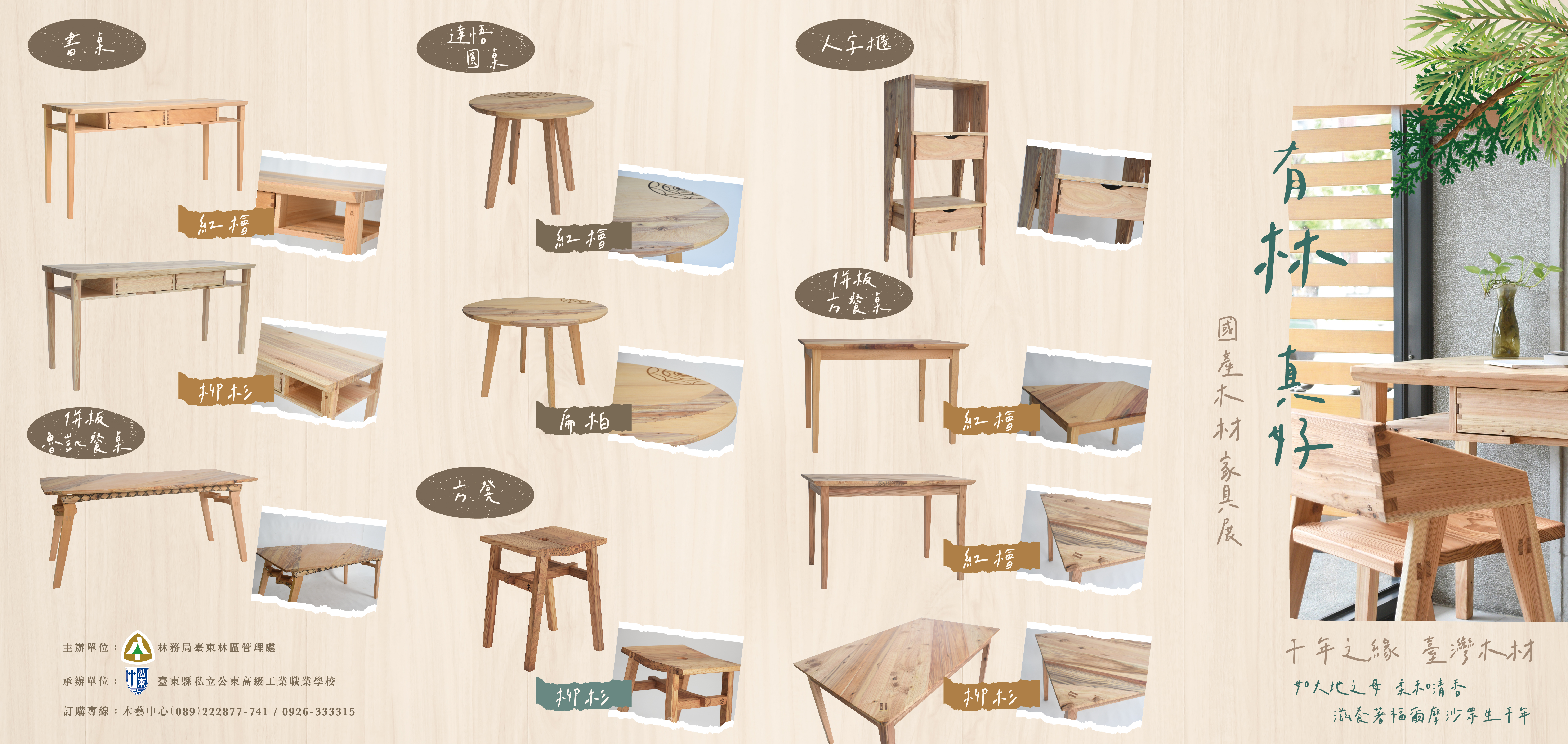 臺東林管處與公東高工攜手創作國產材特色家具,「有林真好-國產木材家具」全國巡迴展第2場將於5月26日(星期五)起進駐高雄左營新光三越百貨公司10樓(高雄市左營區高鐵路123號),至6月4日進行為期10天的家具展售活動,本場次邀請屏東林管處合作展出多款國產材特色家具,合力向國人推介「國產·材好」負碳家具,讓國產木材家具製品有機會進入您我的日常生活。 公東高工是培育木材加工及工藝創作人才的搖籃,更是發展國產家具產業的重要據點,校方培訓出的選手參加國際技能競賽屢獲佳績,木工技術深獲世界肯定,設計製作的家具亦獲各界人士青睞及喜愛,特別是傳統接榫、結構接合工料等技術。近年在林務局及臺東林管處導入多項資源支持下,公東高工於人才培力及產業發展上扎根前行,本次家具展絕大部分的產品,均是運用國產木材結合木工技巧,並加入原住民文化及工藝,將文化元素與傳統技藝巧妙的融入家具產品,也是校方透過教學課程,引導學生在製程中學習相關工藝與文化知識,所激發出來的精彩創作,期待讓國人在接觸溫潤質感國產材家具的同時,更能認識其特殊紋路及材質特性,感受使用低碳足跡國產材家具的價值與優勢。 本場家具展的作品運用了疏伐木紅檜、臺灣杉、柳杉及漂流木紅檜、牛樟、扁柏等。師生們依不同樹種材料特性設計及製作產出高方桌、併板方餐桌、達悟圓桌、書桌、辦公桌、併板魯凱餐桌、方凳、原民風矮櫃、原民風長凳、板型餐椅、原民風魚簍燈、圓滿、螢幕架等28款做工精緻及蘊含美學概念的家具,完美呈現臺灣優質的原木素材及手工全榫卯結構的技術,展售期間歡迎大家前往選購,同時開放電話及公東木藝KTUS Wooden Art粉絲專頁留言訂購,訂購專線089-222877轉741。 今年的「有林真好」3場家具巡迴展首場已於4月14日臺中圓滿結束,第2場將與屏東林管處合作自5月26日至6月4日於高雄左營新光三越10樓展出,第3場則與新竹林管處合作自8月18日至8月27日於竹科管理局尼尼館展出,臺東林管處吳昌祐處長表示,此次家具展係臺東處與公東高工合作推動國產材加值計畫的第三年成果,目的是使國人更認識及使用國產材,讓國產材成為提升居家生活品質及兼顧友善生態環境產業發展的具體實踐,更呼應政府積極推動淨零政策的核心主軸。在綠色消費的百年大計中,「國產的材好」國產木材最能適應臺灣氣候,好用且耐久,邀請民眾前往展場參觀、欣賞及交流,選購您所喜愛的國產材家飾、家具,攜手支持國產材優質產品。