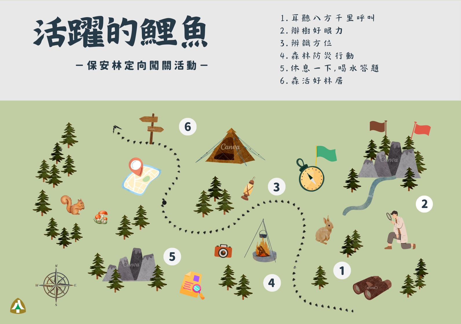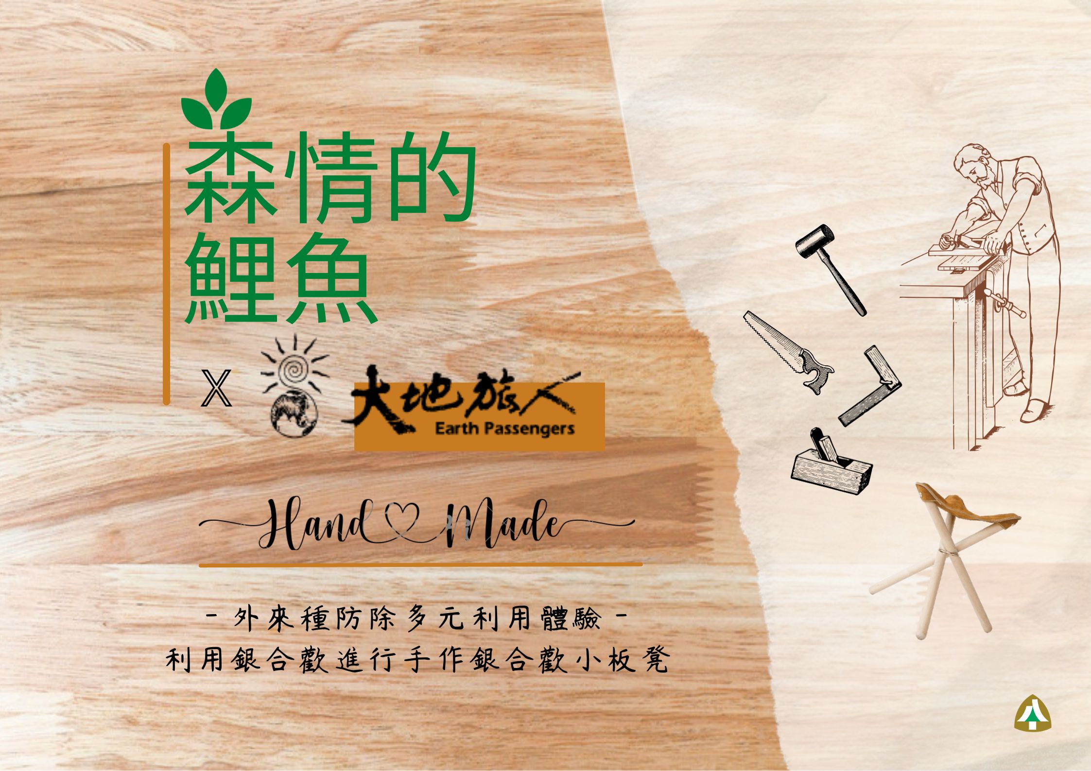 《鯉魚山保安林市集活動—森活的日常》以在地生活日常為設計出發點,清淨家園包含鯉魚山前方鐵馬道及後方正氣北路109巷道路等2條路線,環繞鯉魚山周邊就像幫鯉魚洗澡;定向闖關則在鯉魚山步道進行關卡任務,同時享受林間漫步;文史導覽以鯉魚山保安林所維護的各項歷史、軍事遺構等作為解說對象,可深入瞭解鯉魚山的古往今來;外來種防除多元體驗則結合外來種-銀合歡的移除並運用移除的材料進行手作小凳,各活動項目都十分具有特色。