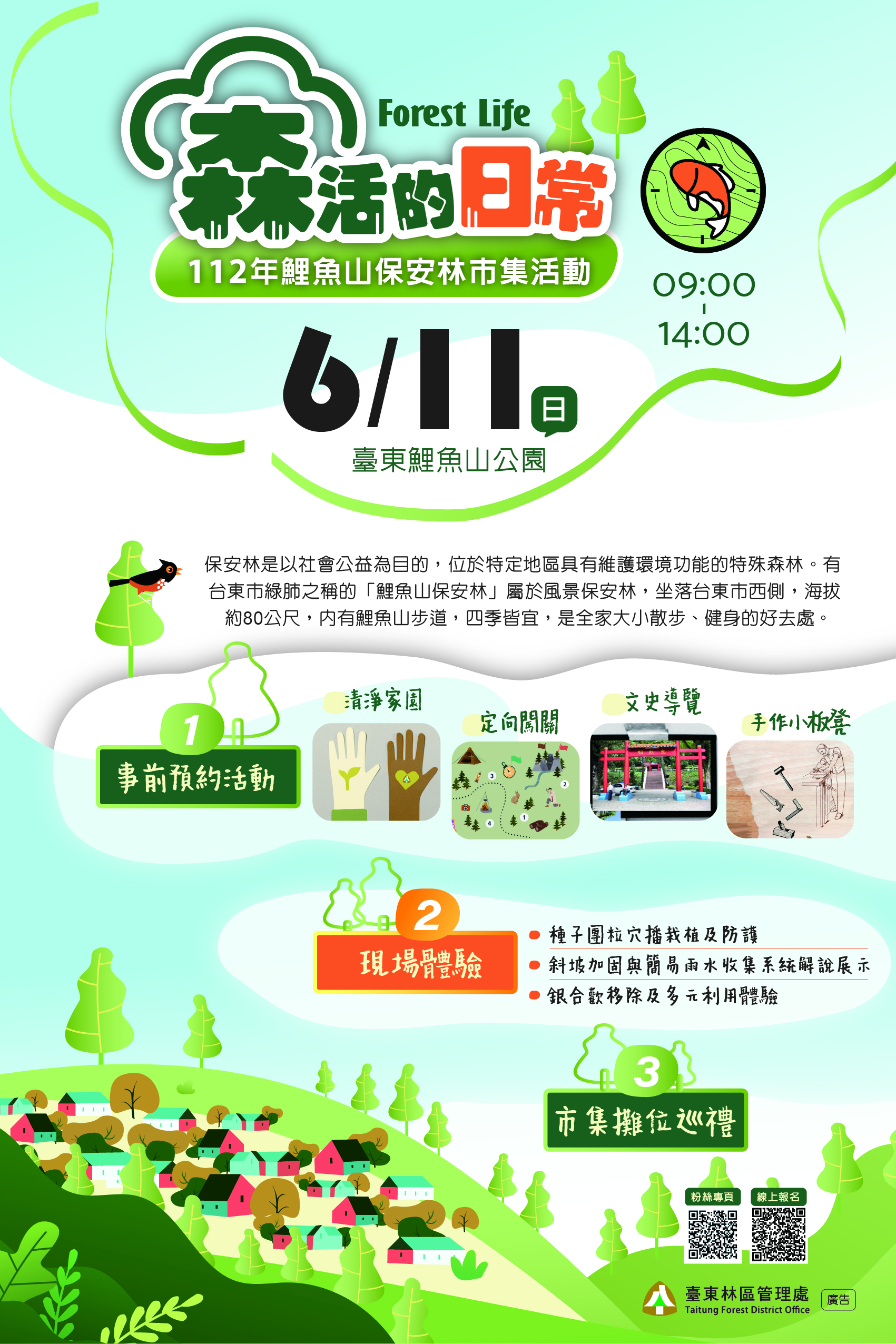 鯉魚山是臺東市的都市綠肺,也是民眾早已融入日常休憩活動、運動健身的自然場域,更是已劃設百年的「風景保安林」。為了讓民眾瞭解鯉魚山保安林的環境功能價值,林務局臺東林管處於本(6)月11日(星期日)將在臺東市鯉魚山公園舉辦《鯉魚山保安林市集活動—森活的日常》,從當天上午9時到下午2時,將進行清淨家園、定向闖關、文史導覽、外來種防除多元利用體驗等各式預約報名活動,現場也設有與日常生活貼近的水電稅務、寵物登記等相關宣導、在地或具特色的攤商市集等,不論是在地生活的「好林居」或是被臺東「森活圈」所吸引的好朋友,都誠摯歡迎您共同體現「森活的日常」。
