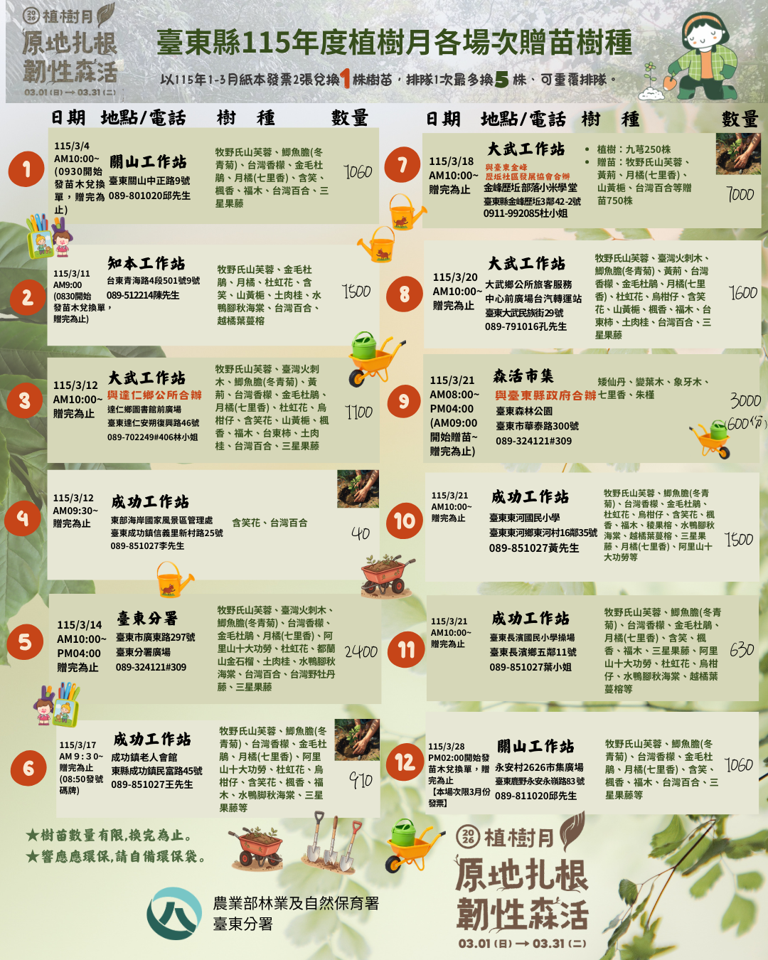 今年度臺東分署及轄下各工作站共舉辦14場次的贈苗活動,地點涵蓋臺東縣關山、知本、達仁、成功、金峰(歷坵村)、大武、東河、長濱及綠島等鄉鎮;臺東分署亦特別規劃於知本國家森林遊樂區、東部海岸國家風景區管理處、臺東森林公園及鹿野2626市集等辦理植樹及贈苗活動。活動場次多於上午開始,建議民眾可參考分署特別製作的場次圖卡資訊,先確認具體日期、時間及兌換方式,或連繫臺東分署及轄下各工作站確認,也可關注追蹤該分署官方臉書粉絲專頁(https://reurl.cc/bN1Y63)的公告。