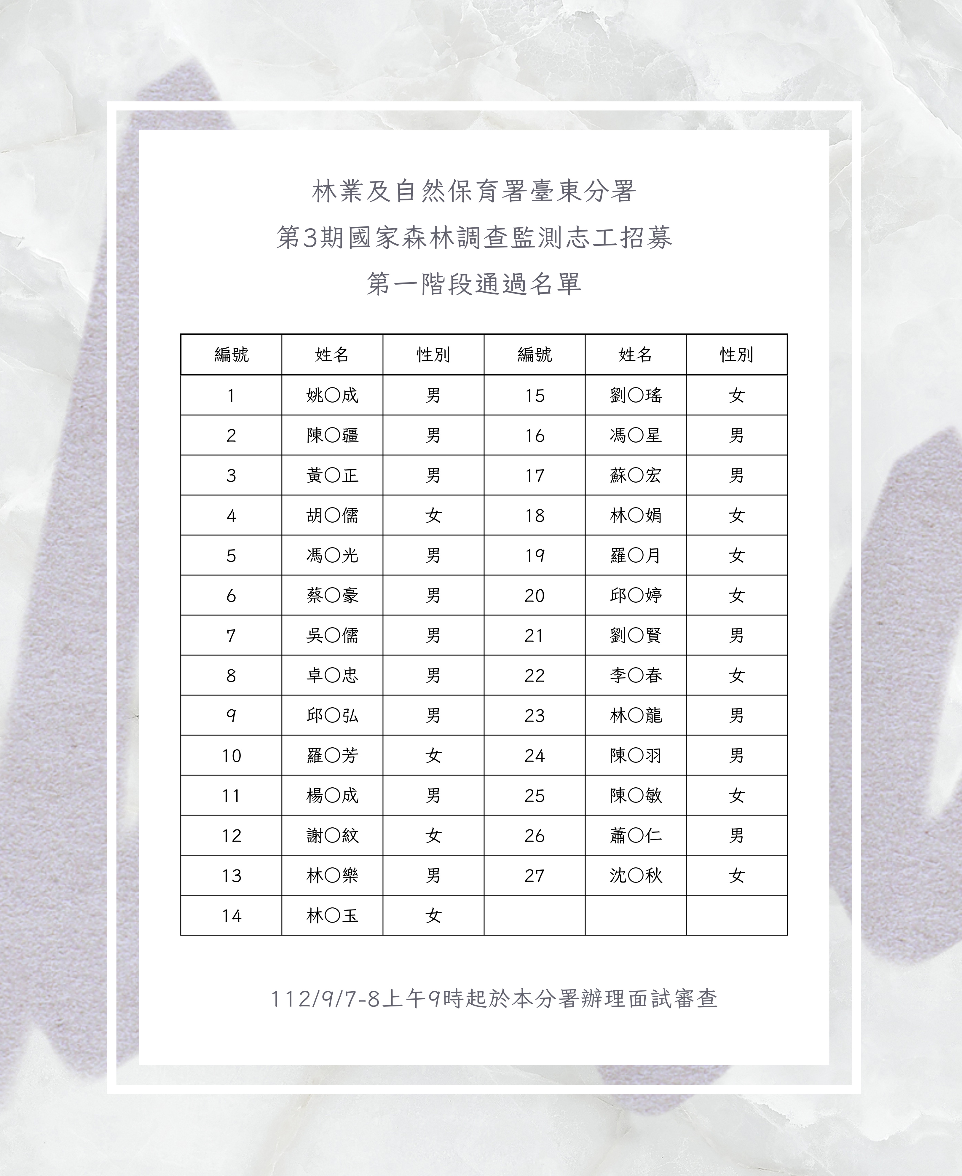 國家森林調查監測長期協助本分署辦理森林巡護、森林資源調查、濫墾及盜伐採等不法林政案件之通報工作,也積極參與淨山、淨灘等環境保護活動,以行動支持生態環境守護工作。 為讓更多民眾能加入本分署森林守護行列於今(112)年5-7月招募第3期國家森林調查監測志工,經初審後共有27名志工進入複審,有關通過名單如下: 01 姚○成 02 陳○疆 03 黃○正 04 胡○儒 05 馮○光 06 蔡○豪 07 吳○儒 08 卓○忠 09 邱○弘 10 羅○芳 11 楊○成 12 謝○紋 13 林○樂 14 林○玉 15 劉○瑤 16 馮○星 17 蘇○宏 18 林○娟 19 羅○月 20 邱○婷 21 劉○賢 22 李○春 23 林○龍 24 陳○羽 25 陳○敏 26 蕭○仁 27 沈○秋
