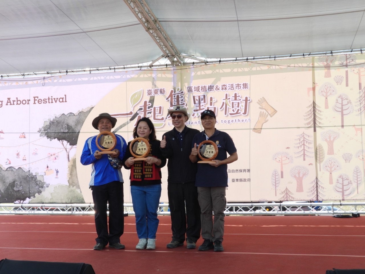 隨後活動現場也頒發國產材結合藝術共創推廣有功人士、造林有功、社區林業績優社區及年度優秀護管員等多項殊榮獎項,表彰他們對國產材推廣、造林綠化、社區保育及山林守護等竭心盡力的支持與貢獻;同時在現場熱鬧登場展售的100多個森活市集攤位,更吸引了近兩千餘位市民及遊客到場盡情選購及品嘗在地美食。臺東縣政府在現場也準備了瓊崖海棠、象牙樹、矮仙丹、桂葉黃梅、變葉木及紅芽赤楠等計3,000株苗木供熱情民眾排隊索取,不到10分鐘苗木就被索取一空。
