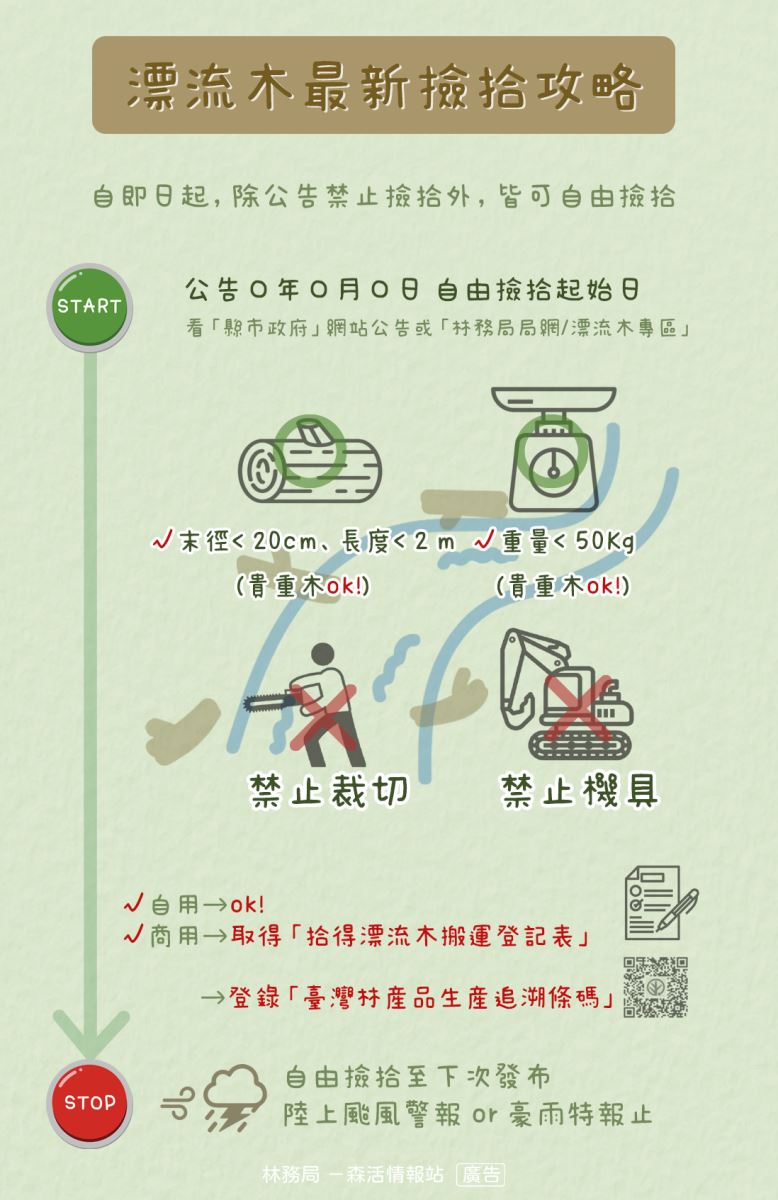 依111年5月9日頒布修正之「處理天然災害漂流木應注意事項」,放寬漂流木公告撿拾條件,撿拾時間從原來一個月,延長自指定日至下次颱風警報或豪雨特報為止,漂流木之規格不論是否為貴重木,倘未經裁切、且無政府註記或烙印標記、末徑小於20公分、長度小於2公尺,或是重量在50公斤以下,都開放民眾自由撿拾。公告期間林業保育署臺東分署將會同臺東縣政府於指定處所設置林產物檢查站辦理檢查及登記,民眾撿拾之漂流木,若後續將轉售或撿拾量體需動用車輛載運者,請拾得人攜帶身分證件到臨時林產物檢查站辦理登記,貴重木採逐支登記,非貴重木採整批重量登記,領取官方登記文件,以取得漂流木合法產權證明,請民眾配合辦理保障自身權益,若民眾撿拾漂流木僅作為自行使用,則無須登記;提醒民眾撿拾之漂流木,如作營利使用,請依森林法第44條第1項規定及「臺灣林產品生產追溯管理作業規範」申請登錄,取得條碼後再行販售,漂流木相關訊息可至林務局網站/國產材專區/漂流木專區查詢。