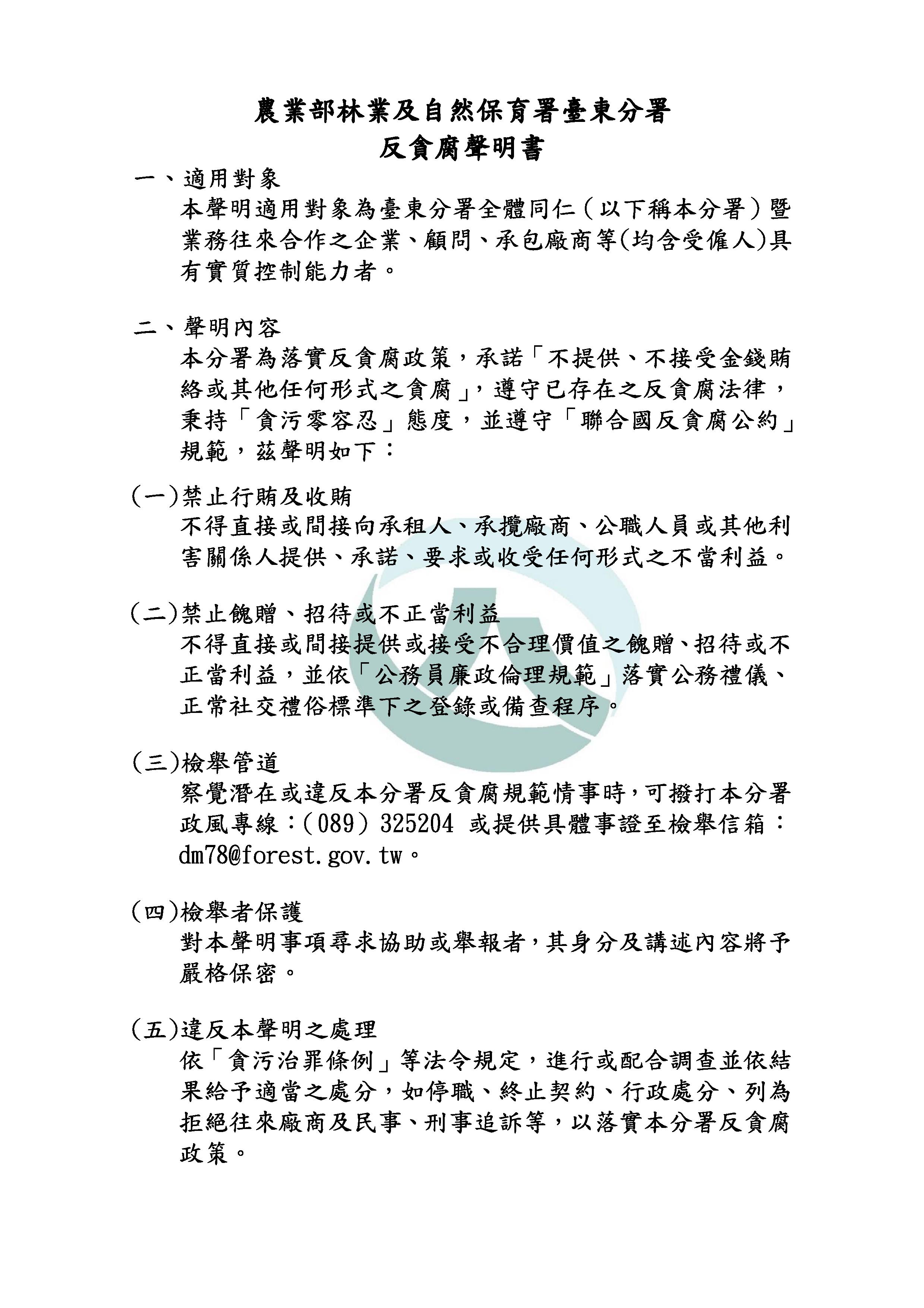 每年的6月8日為世界海洋日(World Ocean Day),在海洋日前夕林業保育署臺東分署今(7)日也組隊響應由臺東縣環境保護局主辦的「永續東海岸:淨灘尋寶趣」活動,並派出以臺灣黑熊為原型所設計的廉潔吉祥物:廉能熊一起參與淨灘。在淨灘的過程中,廉能熊可愛的造型也吸引了淨灘夥伴們的目光,臺東分署政風室胡主任也趁機向淨灘民眾宣導廉潔品格的重要性。 臺東分署近年積極參與行政院「向海致敬計畫」,期許轄內的沿海保安林、海岸線都能維持乾淨的環境面貌。今年也響應縣內舉辦的海洋日淨灘活動,除了表達分署在海洋保育、環保永續的議題上積極參與、不缺席的意願外,也希望籍由眾人之力讓第2502號飛砂防止兼風景保安林(海濱公園)更加乾淨。 除了環境清潔外,品格的廉潔也是分署在辦公環境中落實的重點,臺東分署遵守「聯合國反貪腐公約」規範,訂定了反貪腐聲明書,民眾如有察覺潛在或違反本分署反貪腐規範情事時,均可撥打本分署政風專線 089-325204或提供具體事證至檢舉信箱dm78@forest.gov.tw 。