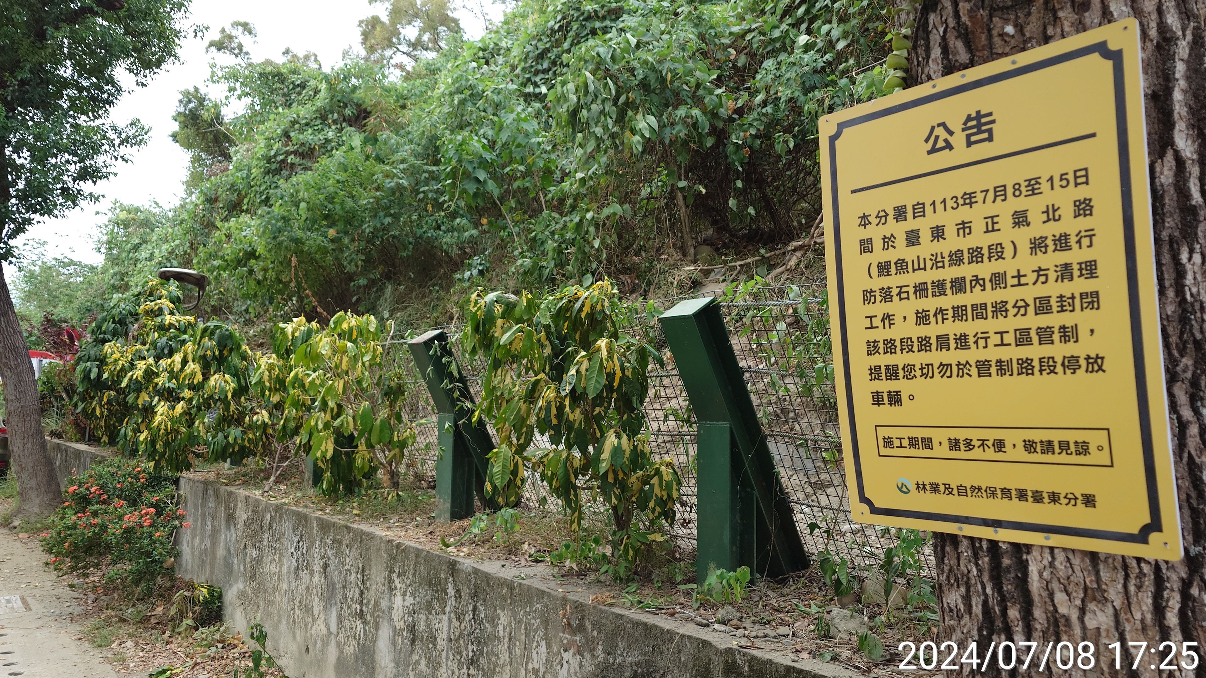 目前正值汛期期間,林業保育署臺東分署於本月8日至17日期間,針對鯉魚山周邊曾有落石路段進行預防性土石清理及邊坡整治工作,一共清理了4處的土石堆積處,清出約150立方公尺的土石。另外,也針對鄰近正氣北路段進行林木修剪,希望能減低颱風季節期間土石崩落及相關災害的發生機率,也期望能有助於提升鯉魚山沿線道路的通行安全。