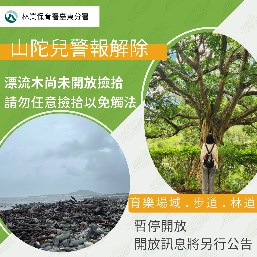 山陀兒警報今晨解除 林業保育署臺東分署呼籲漂流木未再公告前請勿撿拾 爲安全及復原需求育樂場域仍暫停開放