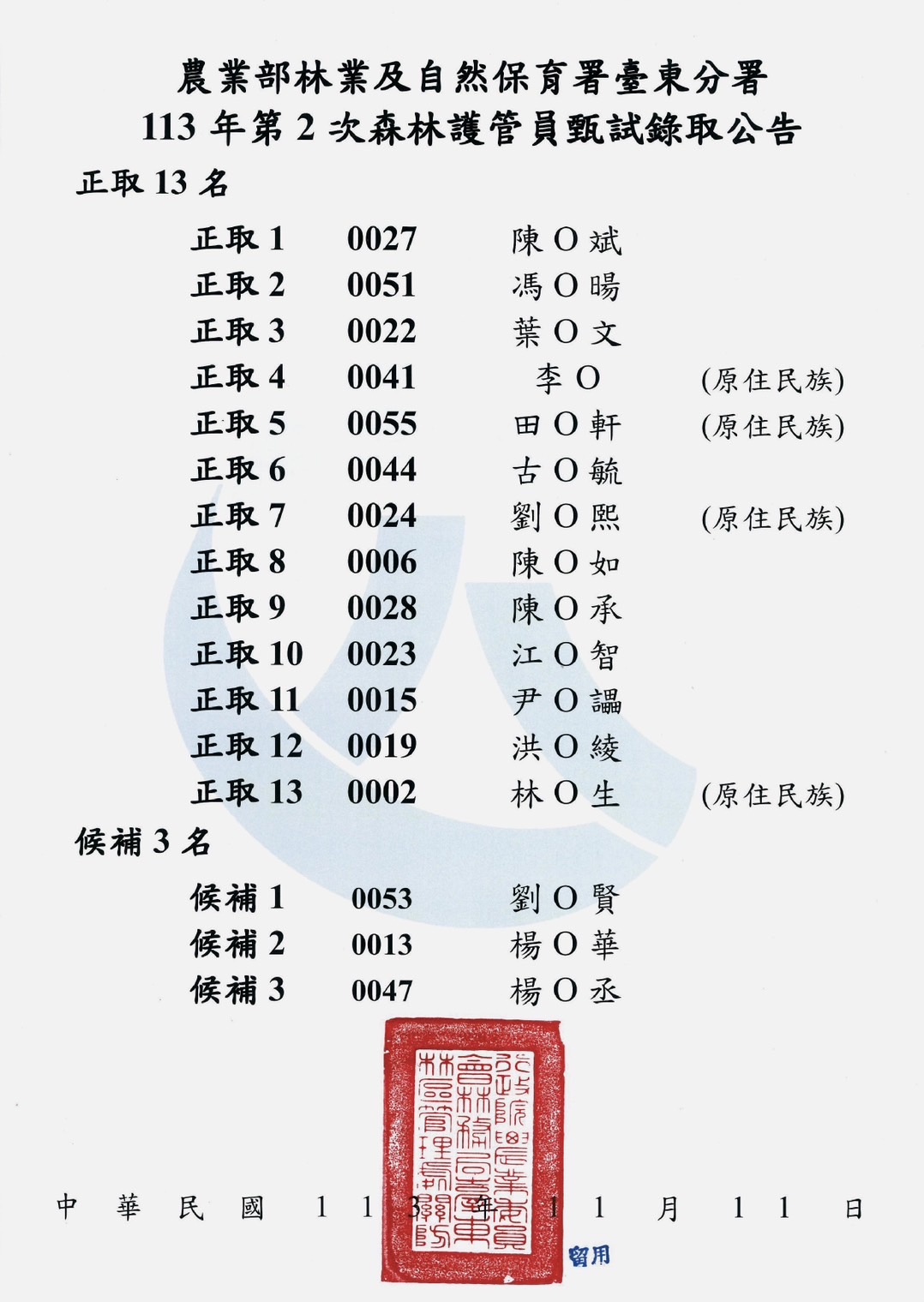 林業保育署臺東分署113年第2次森林護管員甄試今(11)日放榜,本次錄取13名正取者中有9位男性、4名女性,年齡最大的為43歲,最年輕者方22歲,平均年齡約31歲,8成以上的錄取者皆有大學以上學歷,除2位為農林相關科系外,其餘皆非相關科系。正取者中多達8位為臺東在地子弟。4位原住民族正取者,則分別為卑南族、布農族、排灣族與泰雅族,期勉未來這批生力軍能在接受專業的職能訓練後,投入守護東部山林的志業。