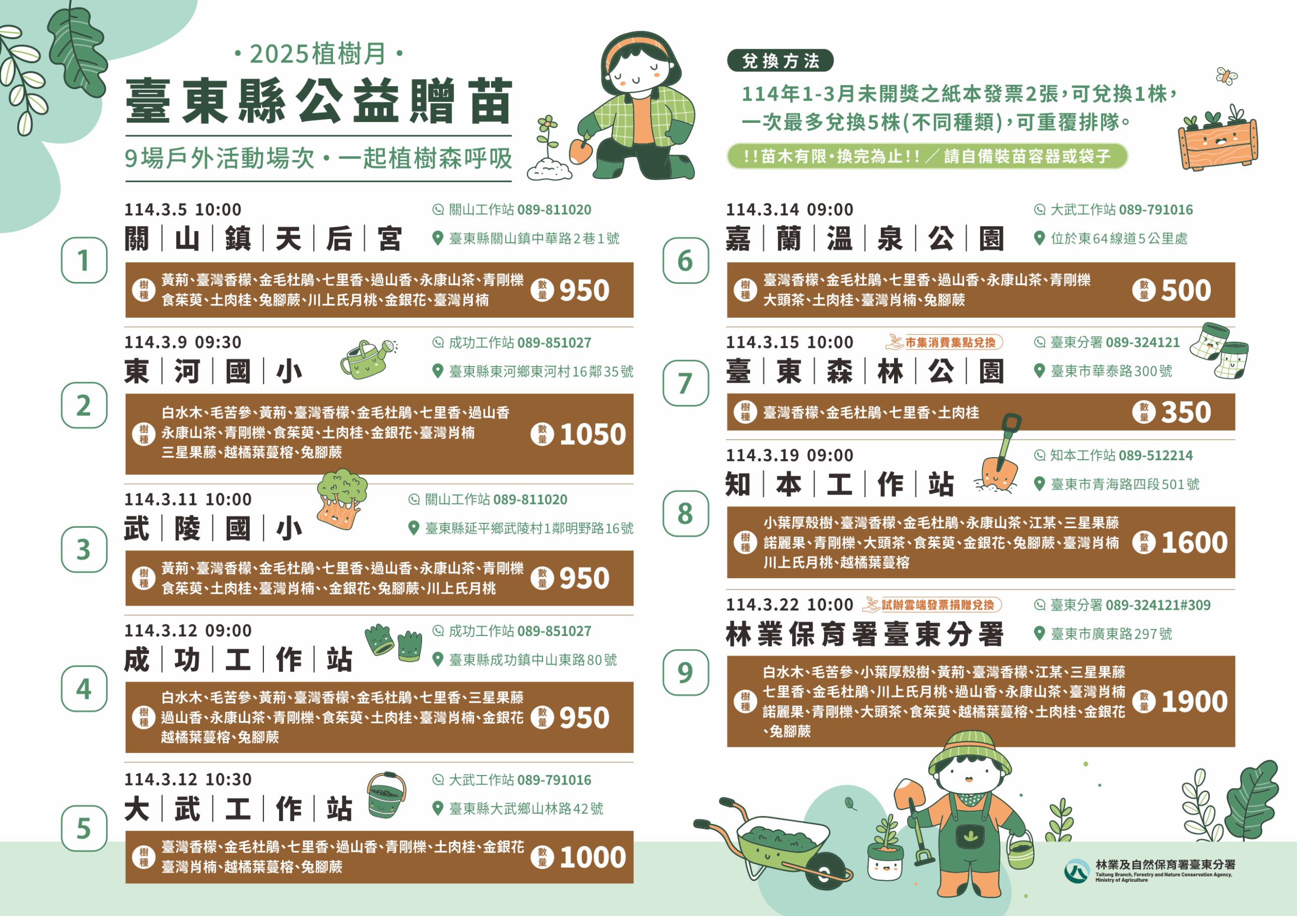 114年林業保育署臺東分署9場次贈苗活動分別是:3月5日10時於關山鎮天后宮;3月9日9時30分於東河鄉東河國小;3月11日10時於延平鄉武陵國小;3月12日9時於臺東分署成功工作站及10時30分於臺東分署大武工作站;3月14日9時於金峰鄉嘉蘭溫泉公園;3月15日9時於臺東森林公園(市集消費滿額贈送);3月19日9時於臺東分署知本工作站; 3月22日10時於林業保育署臺東分署(本場次試辦雲端發票捐贈兌換)。貼心提醒為響應環保,請自行攜帶環保提袋或容器領苗,每場次苗木數量有限、換完為止,如仍有疑問可電洽各場次主辦單位詢問。