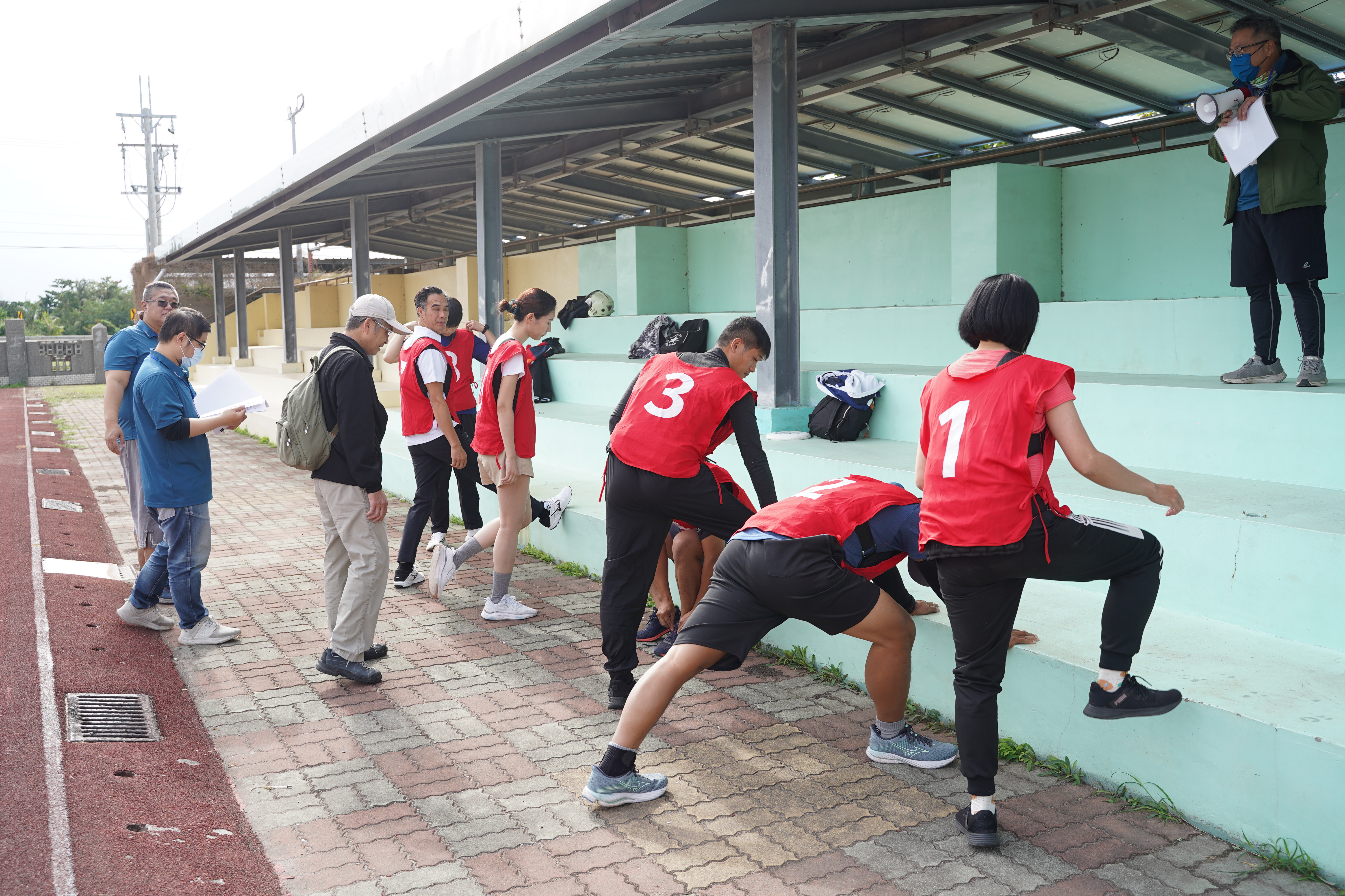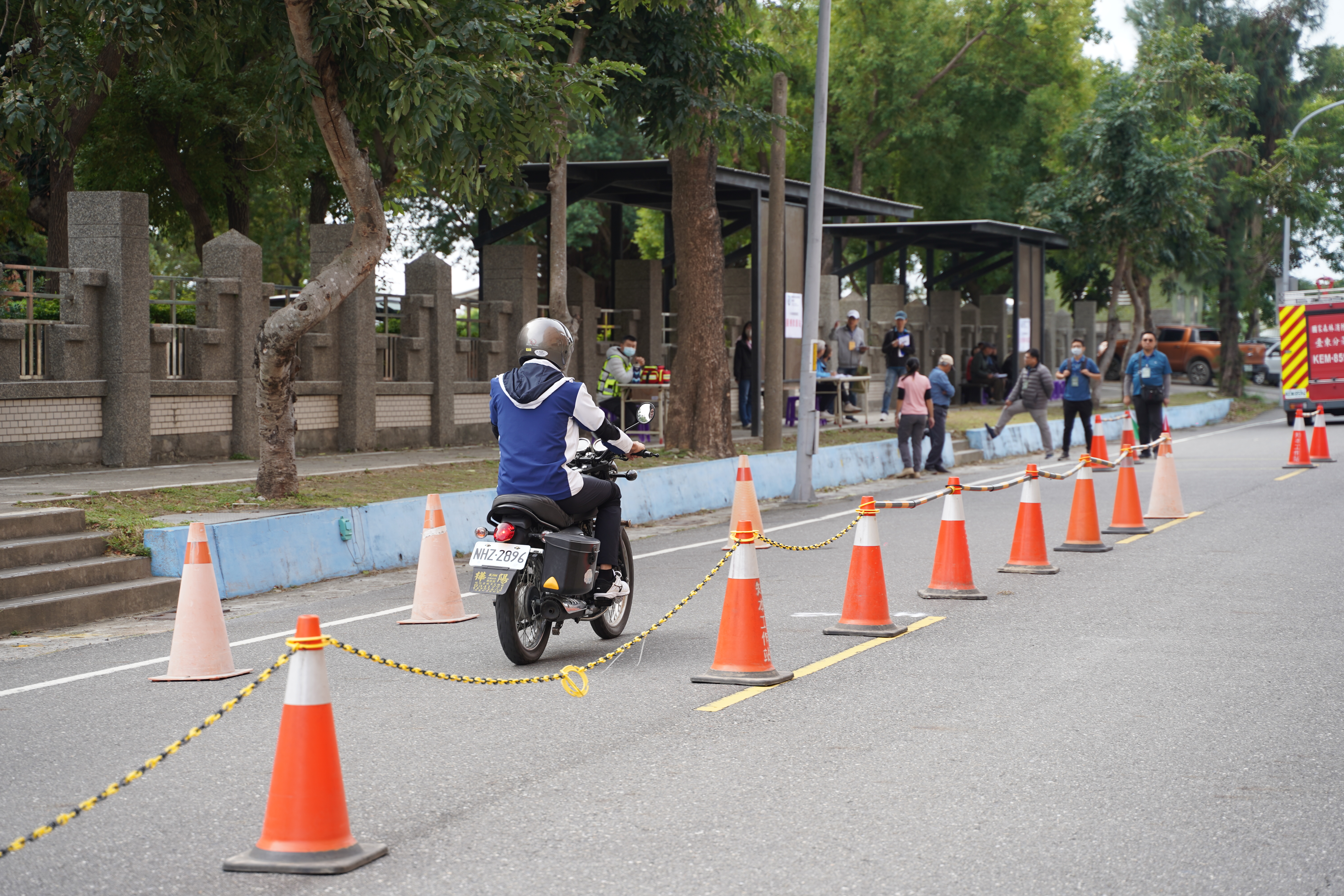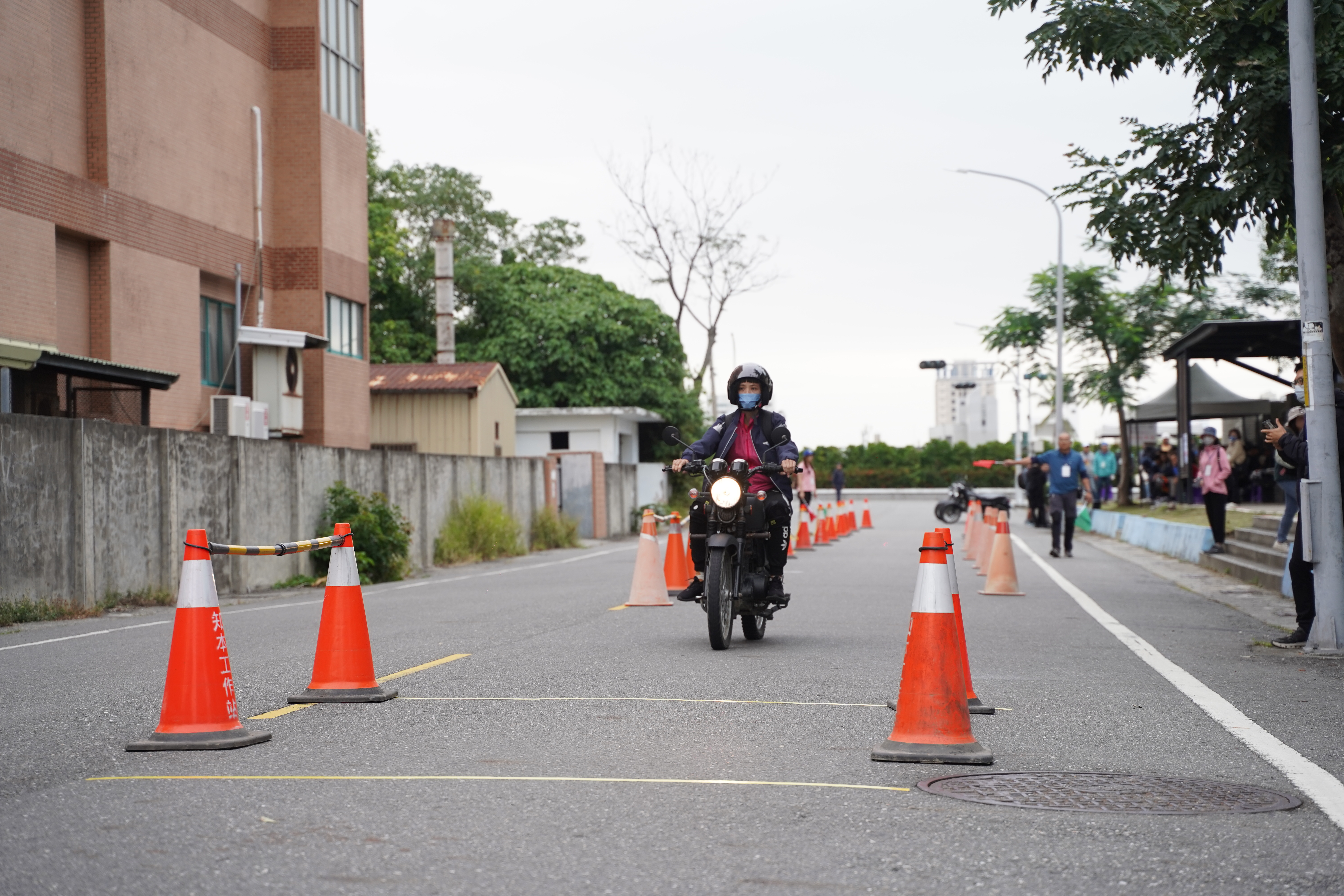 今(29) 日首先登場的術科測驗包含 循環檔機車騎乘與20公斤負重跑走。共有47名考生報到應試,許多考生一早即到場,利用開放練習時間調整手感並熟悉騎乘動線。主辦單位亦準備安全帽、護膝及護肘等防護具,確保測驗安全。第一項循環檔機車測驗2位考生未通過;通過人員接續挑戰負重跑走,需在規定時間內(男性12分、女性 13分30秒)完成1,500公尺測驗。負重跑走最終共有35名考生通過,其中男性最快為7分58秒,女性最快為11分04秒。