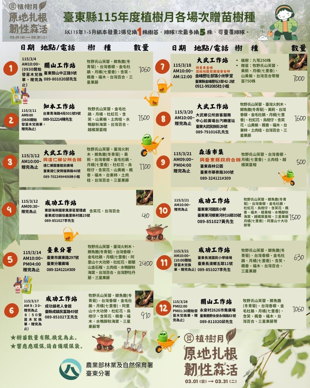 迎接春暖花開的植樹月,搭配今年度植樹月主題「原地扎根・韌性森活」,林業保育署臺東分署預計舉辦14場次的贈苗及植護樹活動,規劃多樣臺灣原生種苗木搭配相關活動發贈。民眾可憑2張115年1–3月未開獎紙本發票兌換1株苗木,活動募集之發票將捐贈縣內公益團體使用,邀請民眾一同從生活出發,感受植護樹行動帶來的環境及社會意義。 今年規劃之苗木涵蓋多樣臺灣原生植物類型,包含適合栽植各式生活場域與環境的樹種與草木,同時亦包含合適植於居家與街角空間之水鴨腳秋海棠、臺灣百合等,期盼將綠意帶入日常,營造貼近生活的森活風景。 本次贈苗植物包含原生的牧野氏山芙蓉、臺灣火刺木、鯽魚膽(冬青菊)、黃荊、臺灣香檬、金毛杜鵑、月橘(七里香)、阿里山十大功勞、杜虹花、含笑花、都蘭山金石榴、長果月橘、山黃梔、楓香、福木、臺東柿、土肉桂、水鴨腳秋海棠、臺灣百合、越橘葉蔓榕、三星果藤等,種類豐富,從草本、灌木到喬木皆有,適合居家與社區環境栽植。 今年度臺東分署及轄下各工作站共舉辦14場次的贈苗活動,地點涵蓋臺東縣關山、知本、達仁、成功、金峰(歷坵村)、大武、東河、長濱及綠島等鄉鎮;臺東分署亦特別規劃於知本國家森林遊樂區、東部海岸國家風景區管理處、臺東森林公園及鹿野2626市集等辦理植樹及贈苗活動。活動場次多於上午開始,建議民眾可參考分署特別製作的場次圖卡資訊,先確認具體日期、時間及兌換方式,或連繫臺東分署及轄下各工作站確認,也可關注追蹤該分署官方臉書粉絲專頁(https://reurl.cc/bN1Y63)的公告。 臺東分署表示,今年植樹月贈苗活動將搭配不同場域與主題辦理,結合森林街角市集、區域植樹行動及環境教育推廣,讓民眾在領苗的同時,也能透過市集、體驗與交流,認識原生植物、生物多樣性及國土綠網等重要議題。提醒民眾為響應環保,請自行攜帶環保提袋或容器領苗,苗木數量有限,送完為止,相關活動資訊請留意活動海報或洽詢各場次主辦單位。